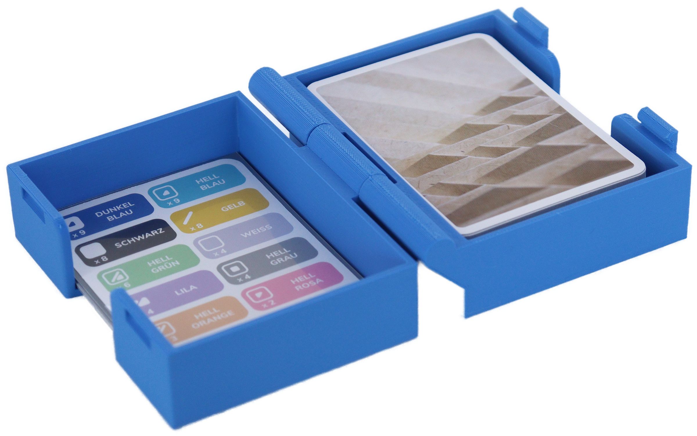 - Unlike the original packaging, the cards fit sleeved* into the holder (max. external dimensions: 67 x 95 mm).
