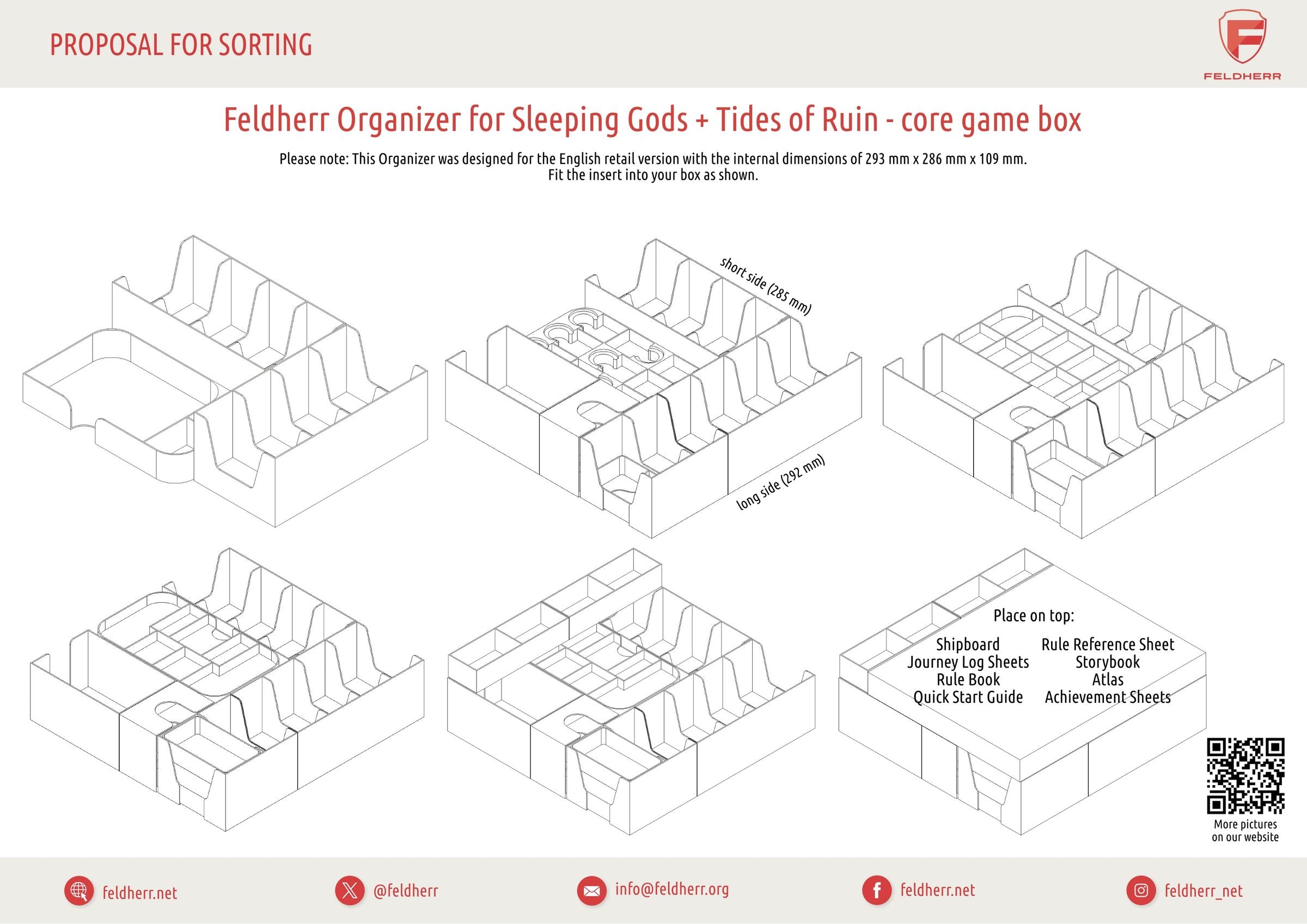 - The plastic Organizer fits perfectly into the original "Sleeping Gods" core game box. Please note: Our solution was designed for the English retail version with the internal dimensions of 293 mm x 286 mm x 109 mm. (Organizer dimensions: approximately 292 mm x 285 mm x 102 mm).