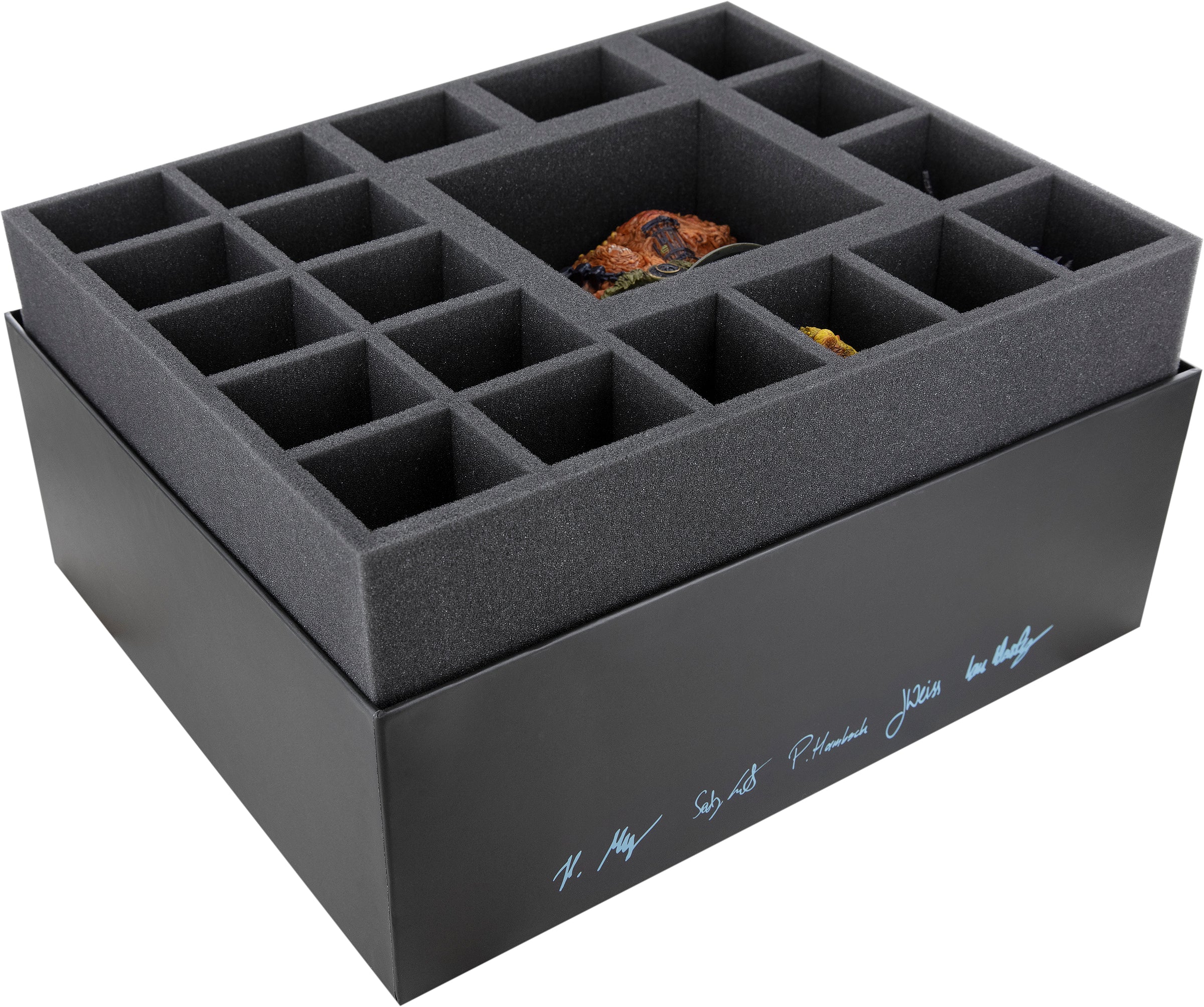 - 1 foam tray with 43 compartments for small and regular sized miniatures + game materials like dice and tokens.
