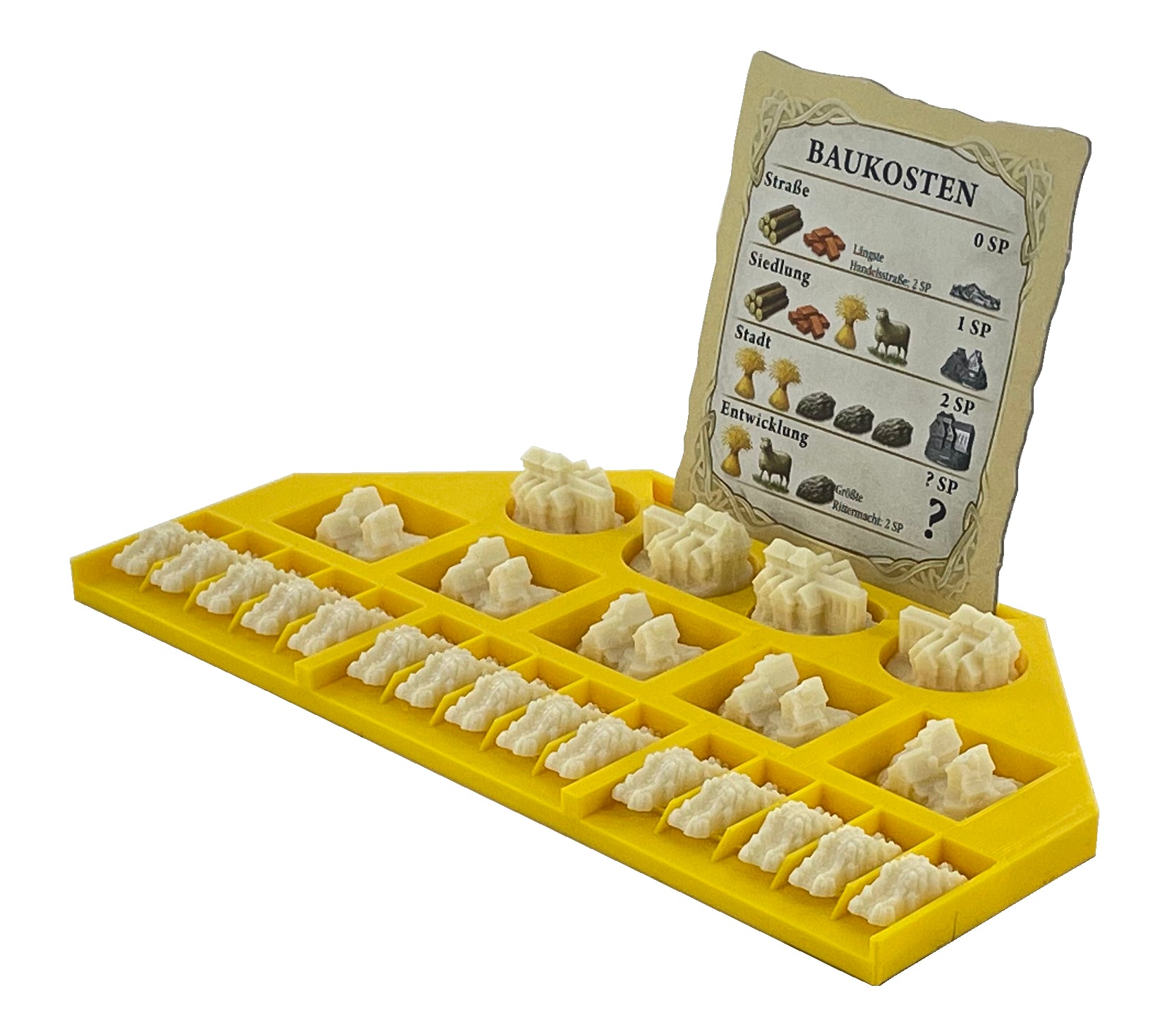 Cities, settlements, and roads are important to your success in Catan. Sprawling on the table, you may lose sight of the small miniatures. And then, at a crucial moment, you have none at hand.