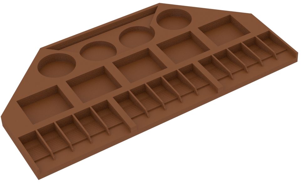 • The models of the cities and settlements are stored in deep compartments, while the compartments for the streets slope inwards. The miniatures don't slip during play but can be easily removed from the compartments.
