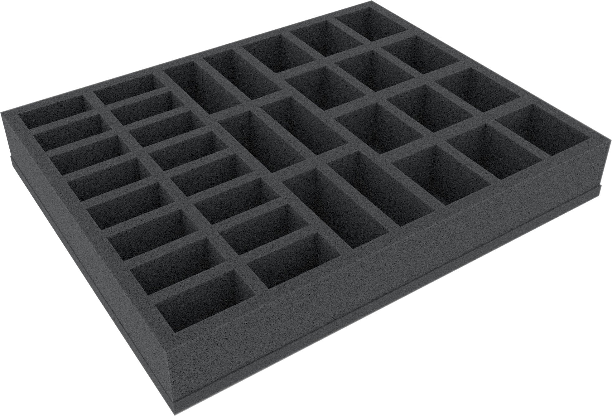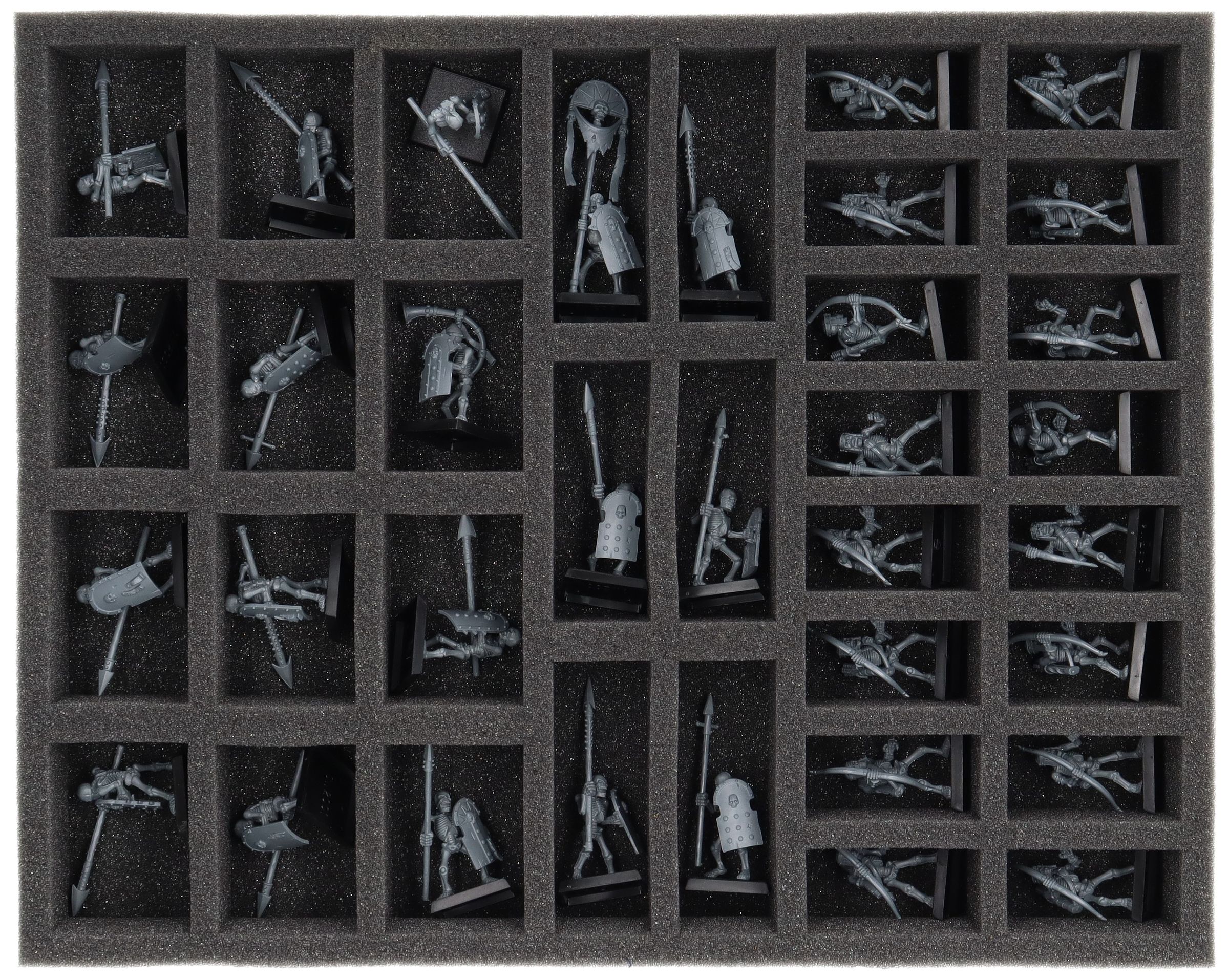 This Full-Size foam tray features 34 compartments of mixed sizes with particularly deep compartments for bulky miniatures like Skeleton Warriors, Skeleton Archers, and models of similar dimensions.
