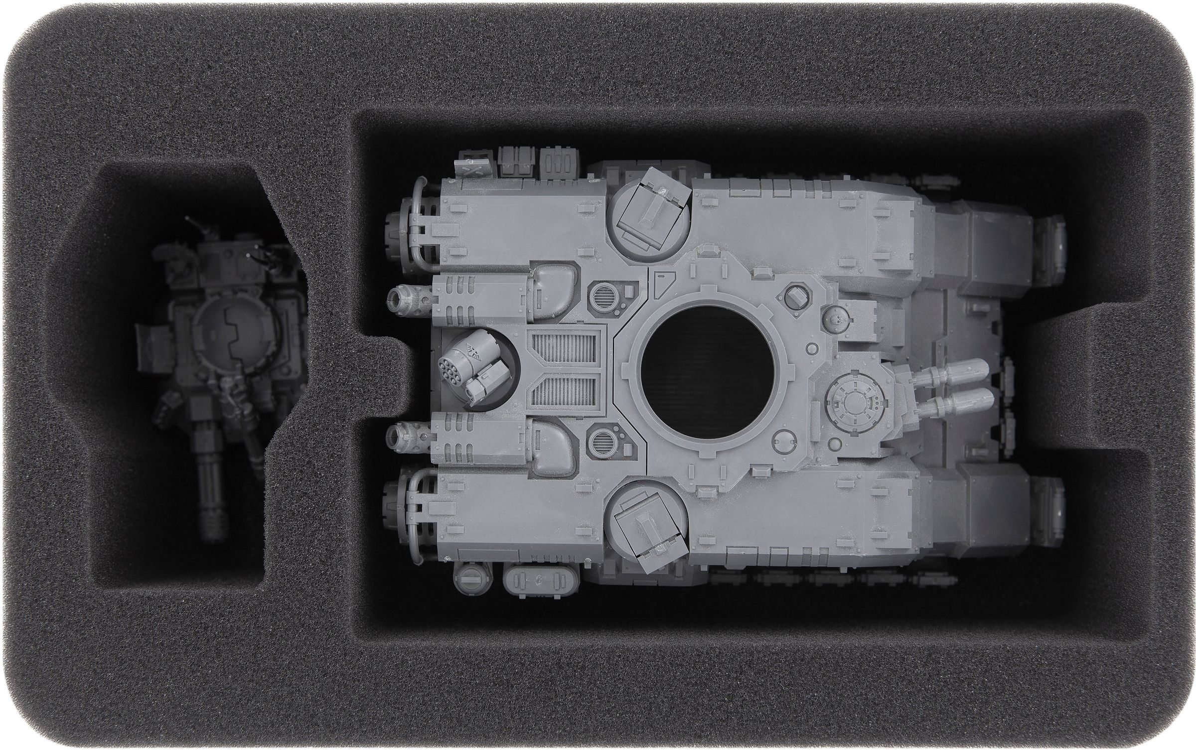 This Half-Size foam mat has a large compartment that has been tailored exactly to the dimensions of the Primaris Space Marines Repulsor. This ensures that its huge arsenal of weapons remains undamaged on the tank. The heavy onslaught gatling cannon on the turret and the twin heavy bolter on the front remain just as intact during transport as the radar arrays.