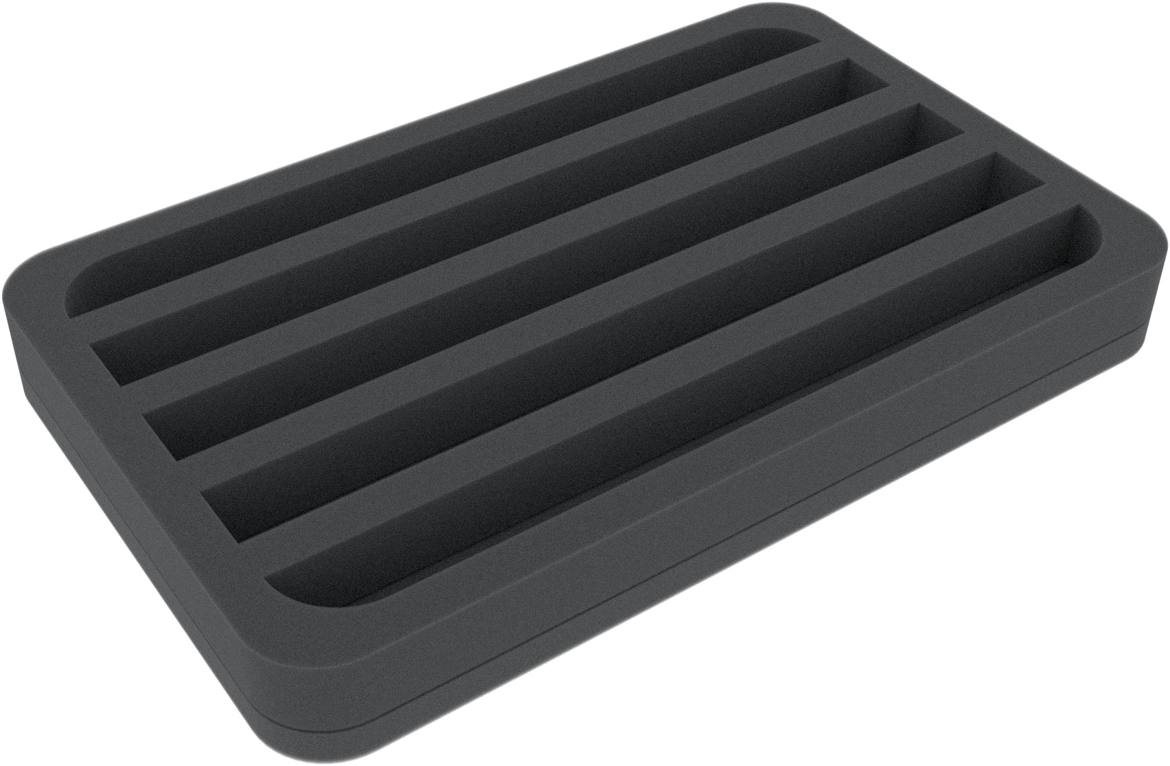 This 30 mm mm high foam tray is divided into 5 compartments. It is particularly suitable for the safe storage of tabletop and board game miniatures, model trains, as well as other fragile models and small parts.