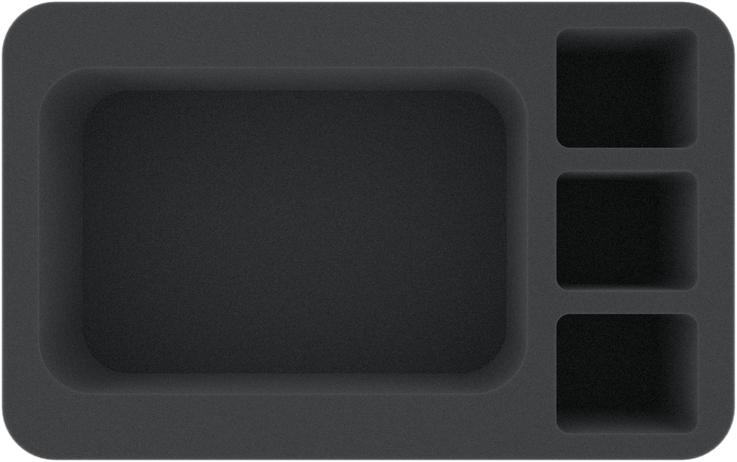 This Half-Size foam tray has 4 compartments of different sizes, one large rectangular compartment and three smaller ones. It is particularly suitable for safely storing a large miniature together with three smaller ones from different board games and tabletop systems. Game material, such as tokens and dice, as well as other small items can also be neatly stowed here.