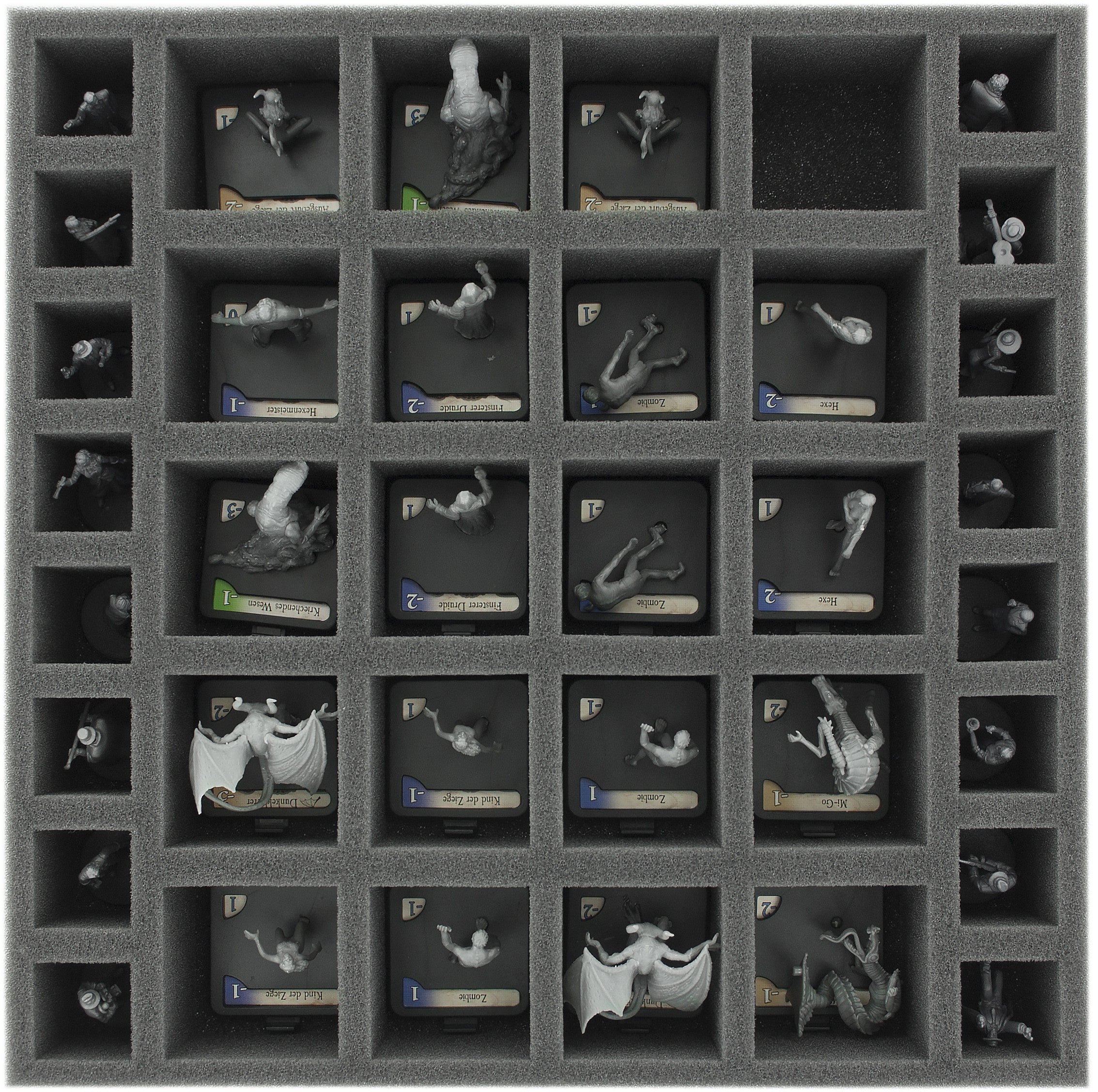 Two trays with 50 compartments for all large and small miniatures from the two expansions for Mansions of Madness Second Edition. All miniatures of "Recurring Nightmares" and "Suppressed Memories" fit into the foam trays. The foam insert fits perfectly into the original board game box, or into the Feldherr box LBBG.