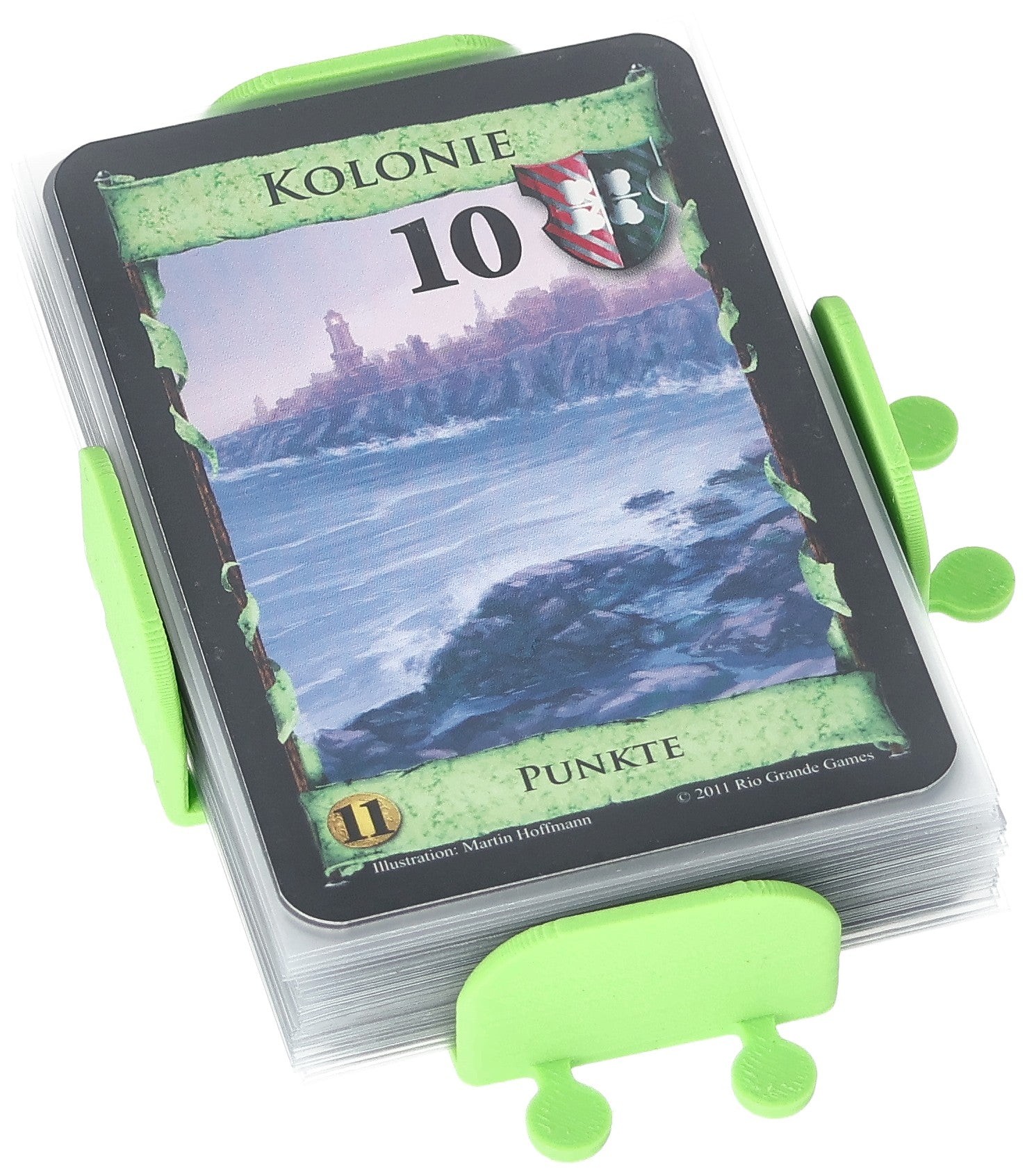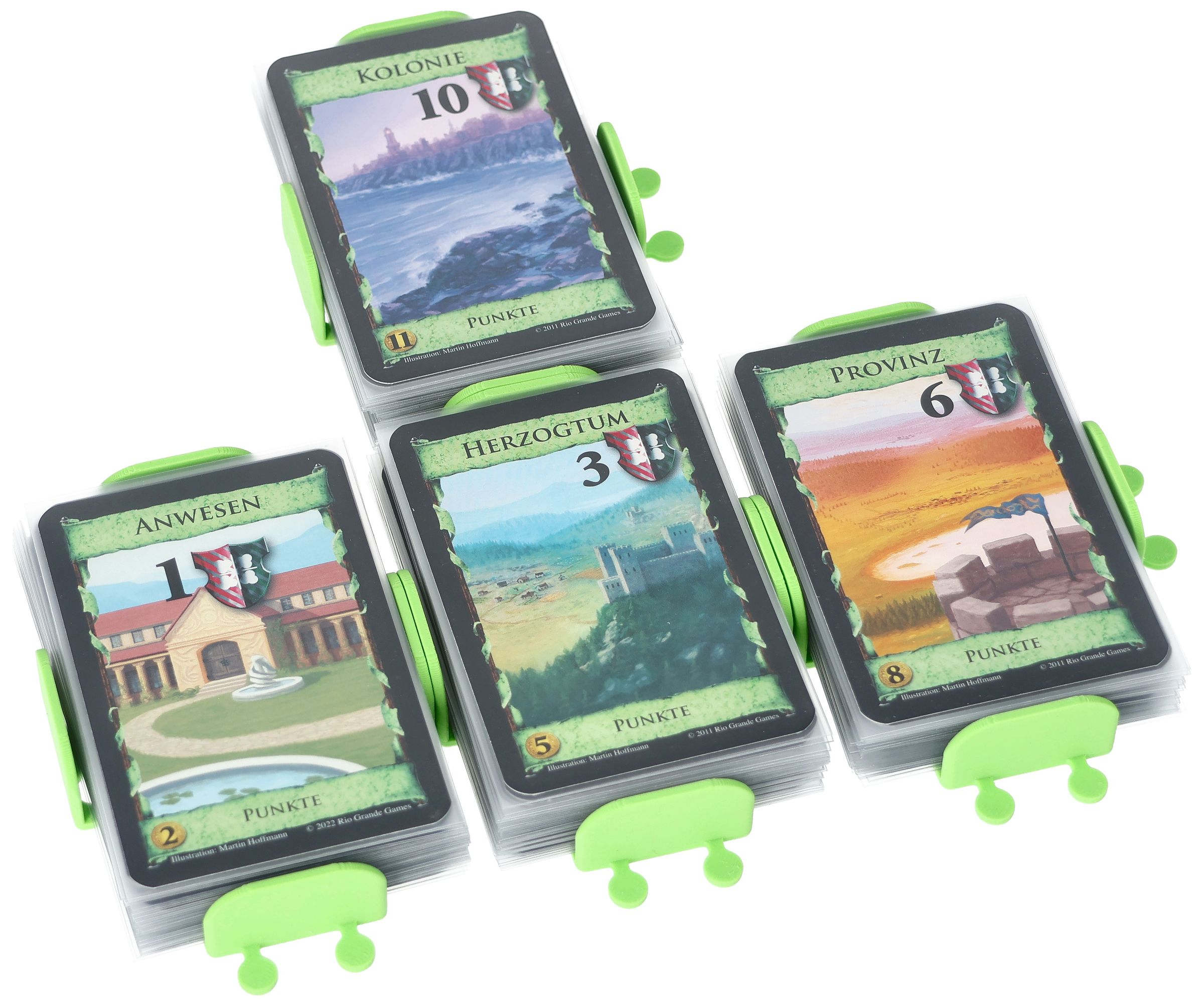 • The green color of the card holder resembles the green of the basic Victory cards and will lead to an improved overview.
