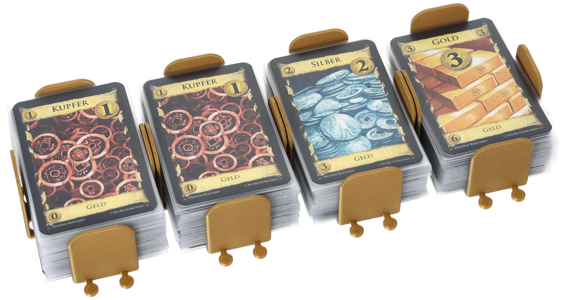 With this Feldherr plastic card holder, you store the basic Treasure or Curse cards, create order on the tabletop and hinder the card stacks from collapsing.