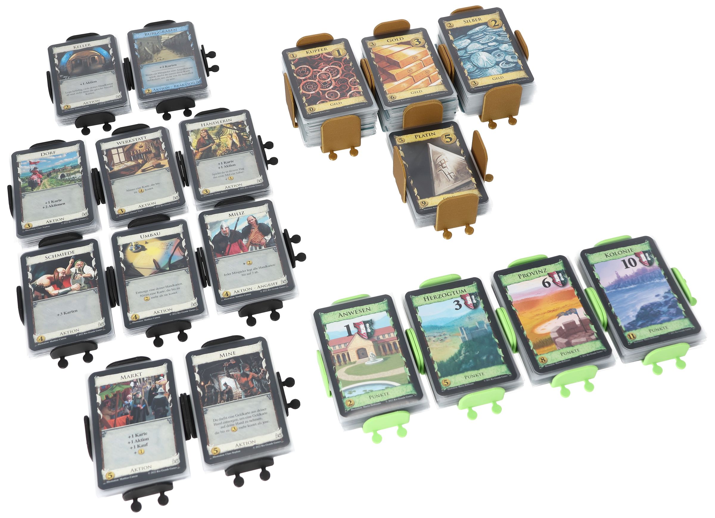 - The colors of the card trays are based on the colors of the Victory, Kingdom, Money and Curse cards and thus provide a better overview.