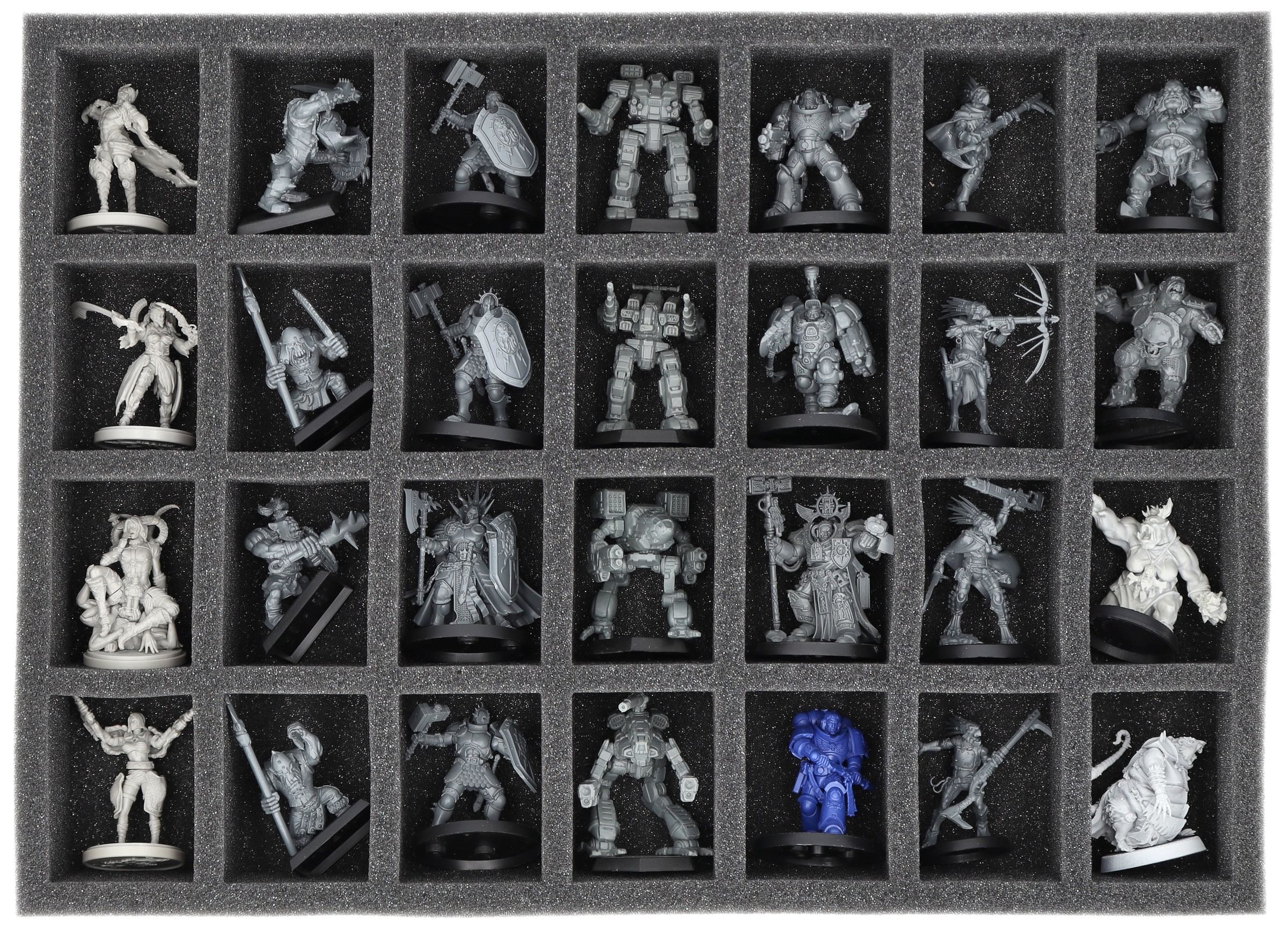 - Three foam inserts with 28 compartments each for miniatures - 84 compartments in total - compartment size: 54 mm long x 41 mm wide x 40 mm deep