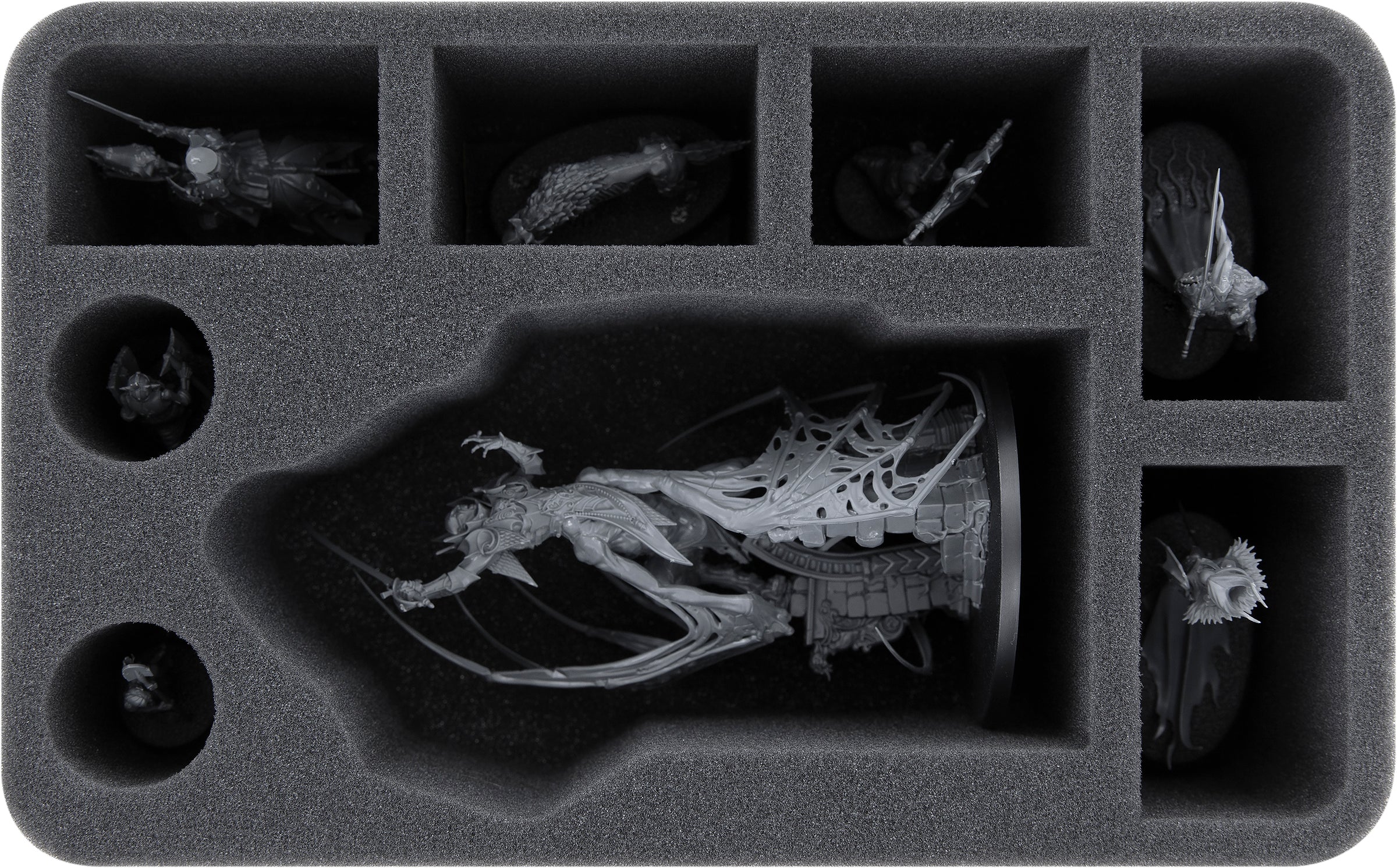 Lauka Vai, Mother of Nightmares, received a model reflecting the monstrous nature of her kin. Her nightmarish body is full of delicate details. The sight of the long, thin claws on the back of the wings or the elegant sword will make your blood pressure skyrocket. To help you transport the incredible miniature without using blood pressure-lowering drugs, we designed a matching Feldherr foam insert for the model of Lauka Vai.