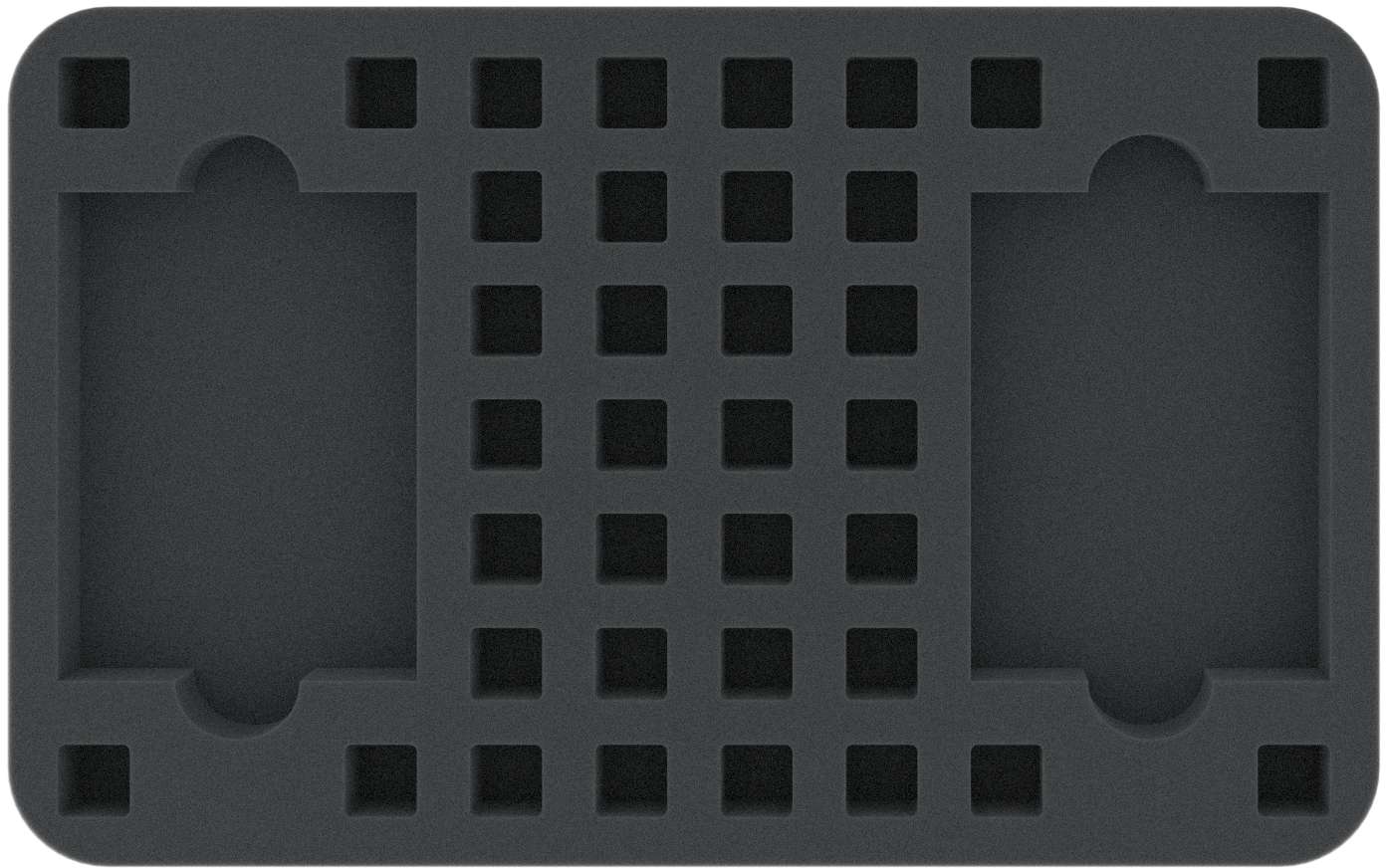 This foam tray has two card compartments for 25 Kill Team cards each. Therefore you can store up to 50 Tactics, Mission and Data cards (with sleeve) with this insert.