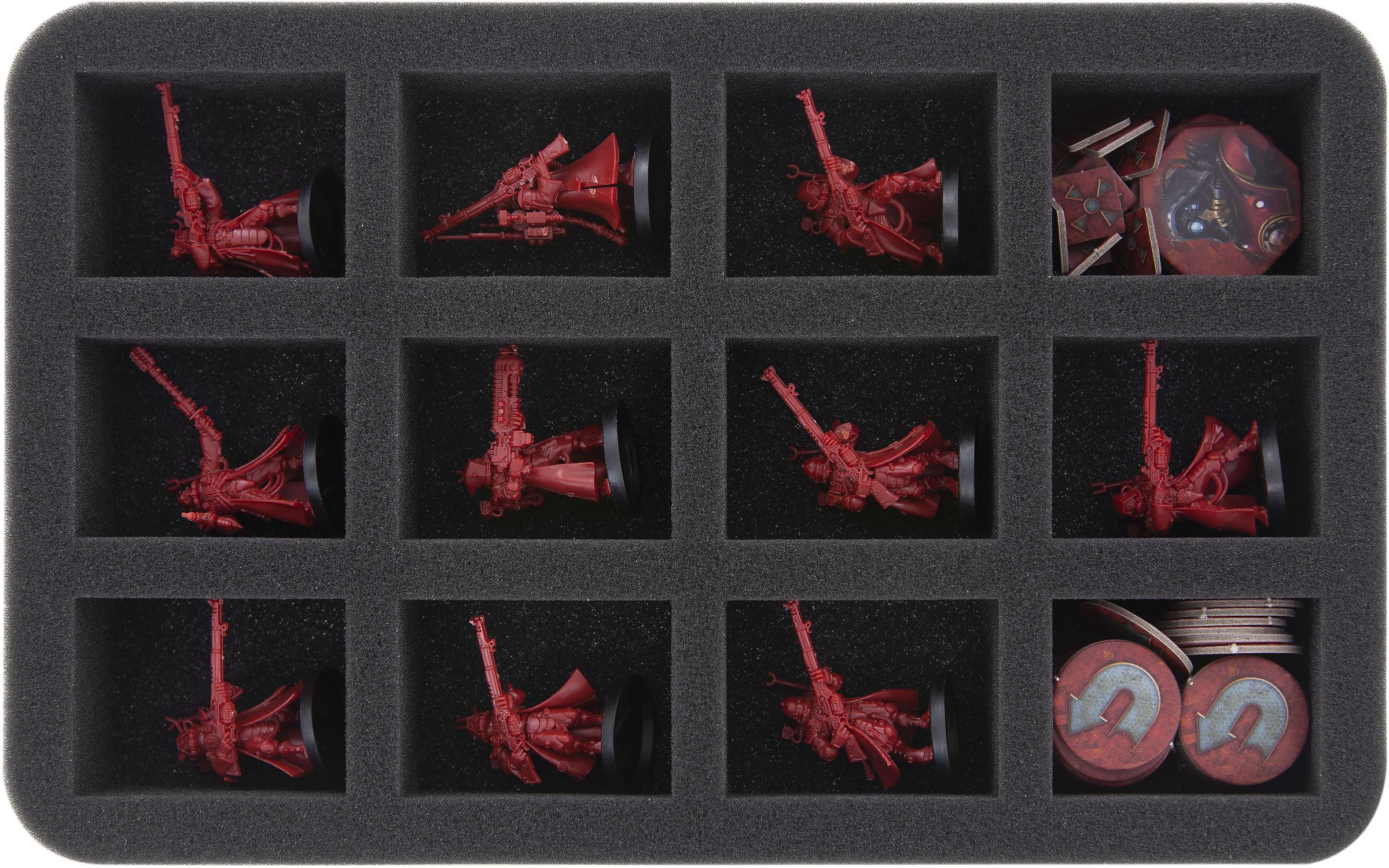 The mat is divided into 12 compartments of different sizes. They are tailor-made for the Skitarii models of your Adeptus Mechanicus Kill Team. Surrounded by foam, the sensitive antennas are just as safe from damage as Radium Carbines and Galvanic Rifles. The precisely fitting compartments also ensure that the figures do not slip around or collide. Thus the colours of painted Skitarii miniatures are also optimally protected.