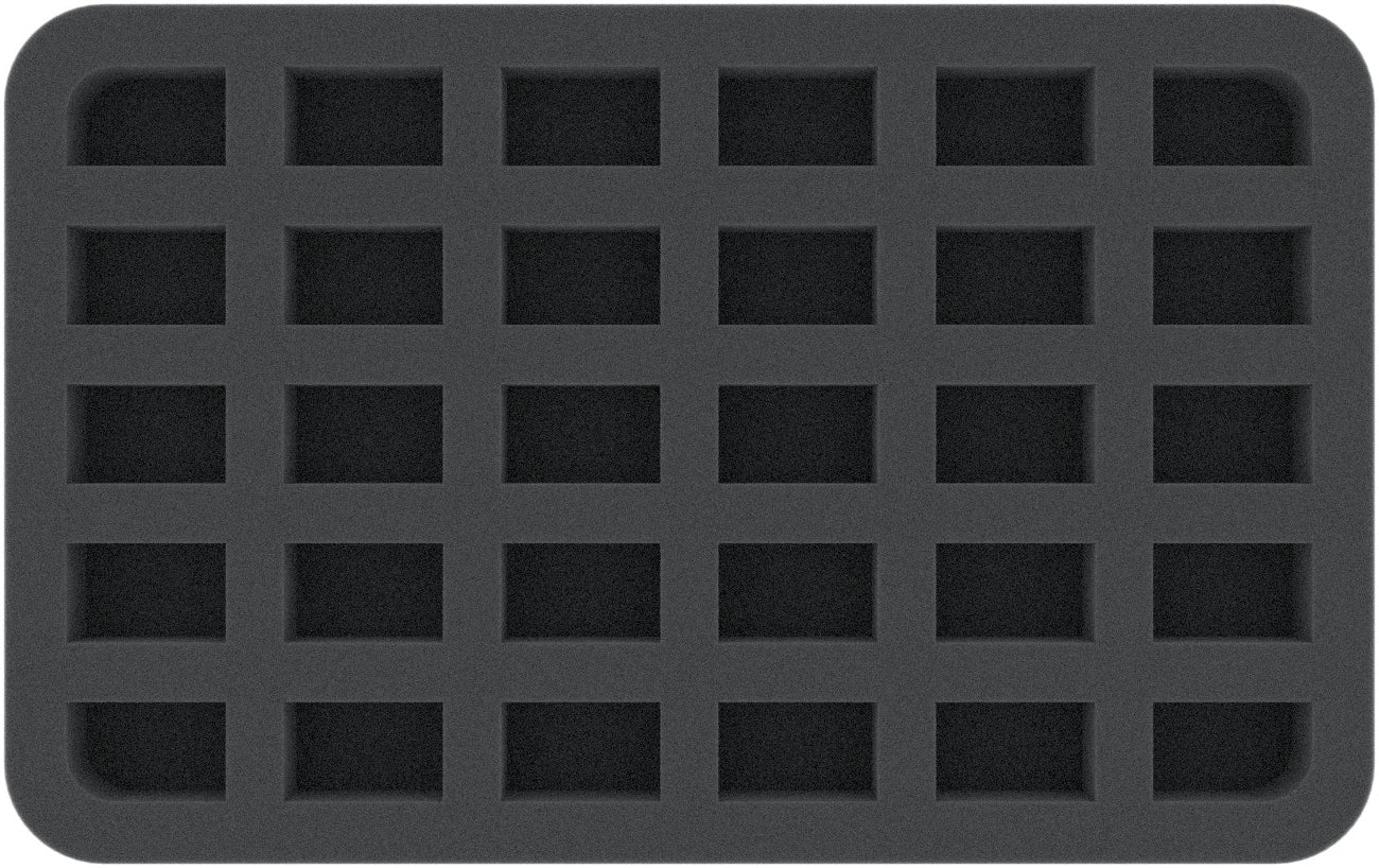 This Feldherr foam tray has 30 same-sized compartments for the clear and safe storage of wargaming miniatures in scale 1:100 (15 mm). The tray is thus ideally suited for miniatures of e. g. the games "Flames of War" or “Dropzone Commander".