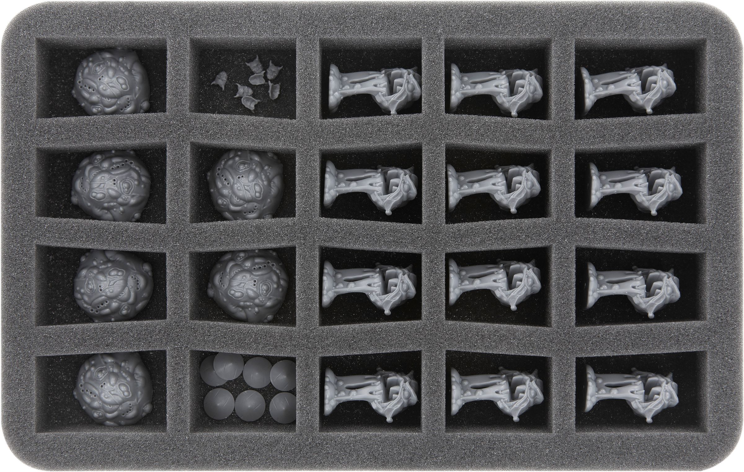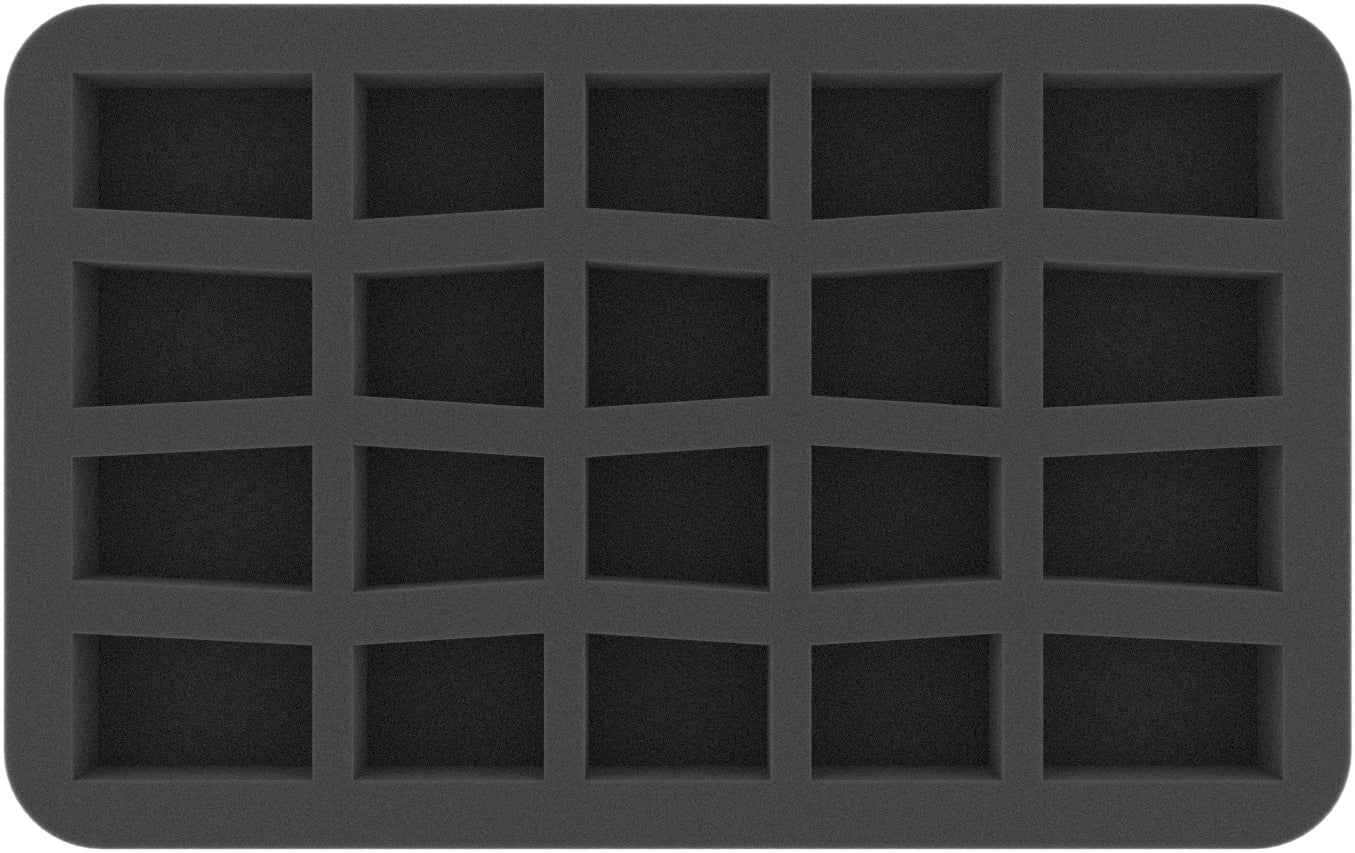 This Feldherr foam tray has 20 conical compartments for the clear and safe storage of wargaming miniatures in scale 1:72 (20 mm). The tray is thus ideally suited for miniatures of e. g. the games "Behind Omaha", "Rapid Fire" oder "Point Blank Game". The conical shape of the compartments allows for optimal usage of space.