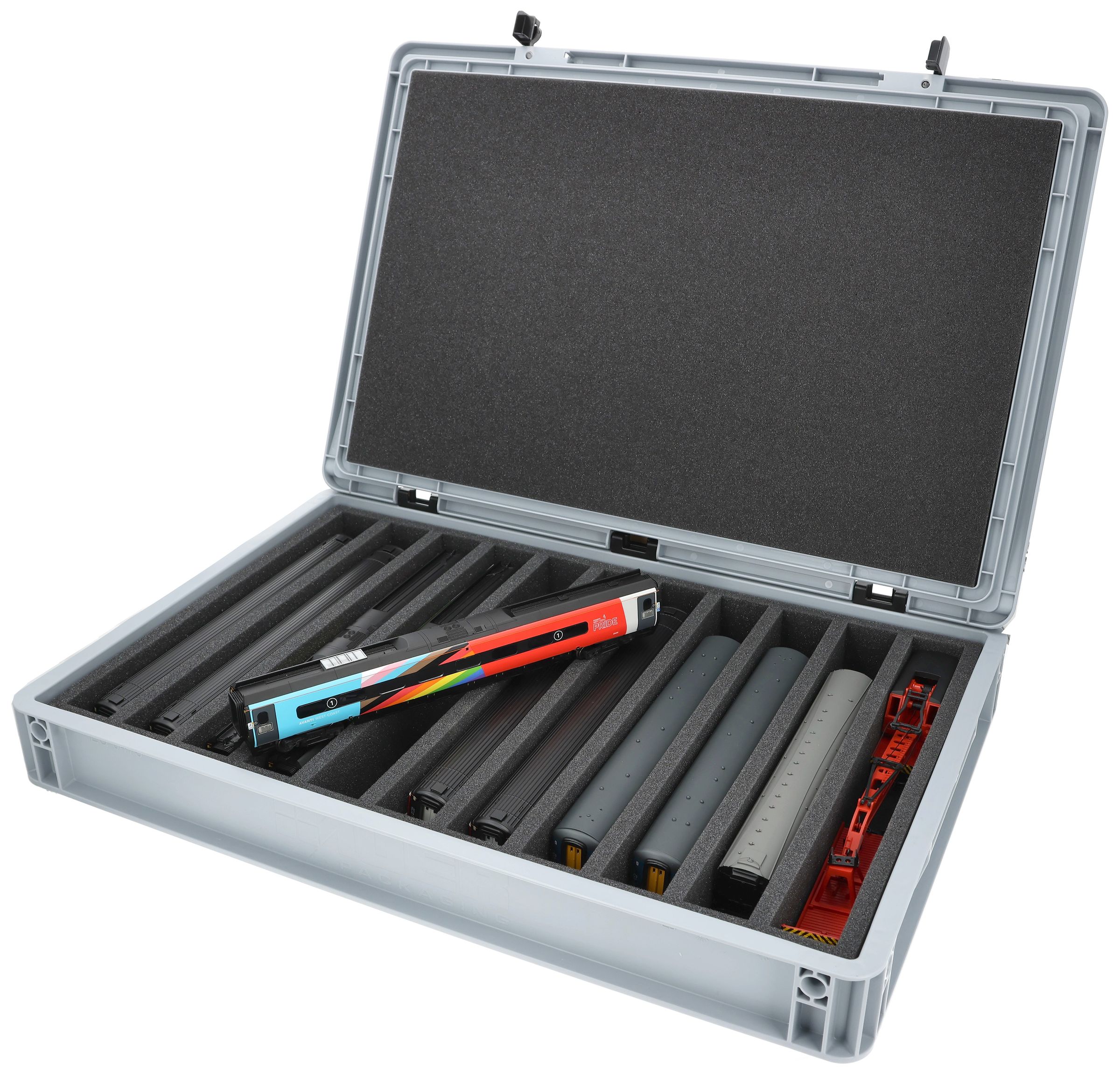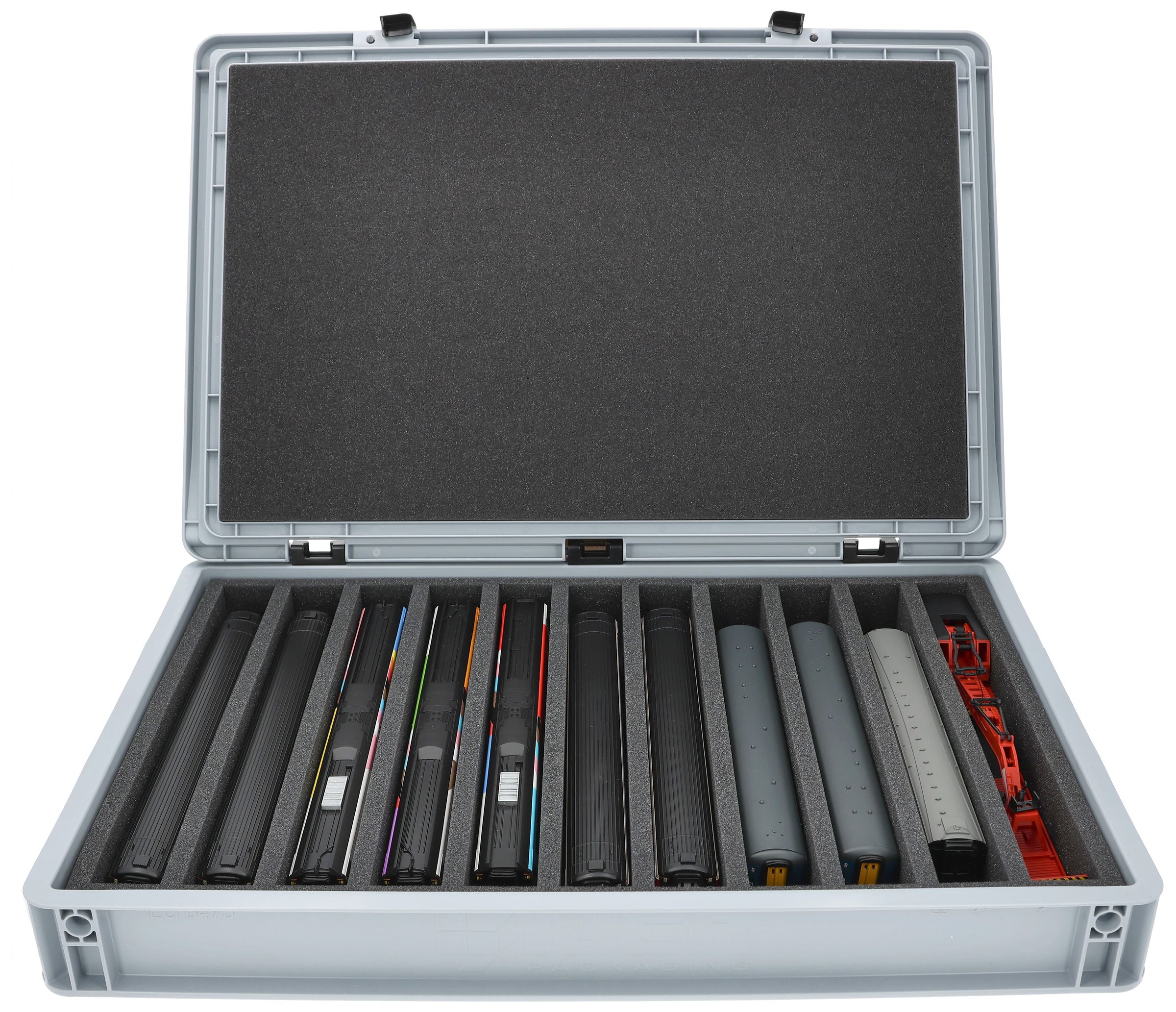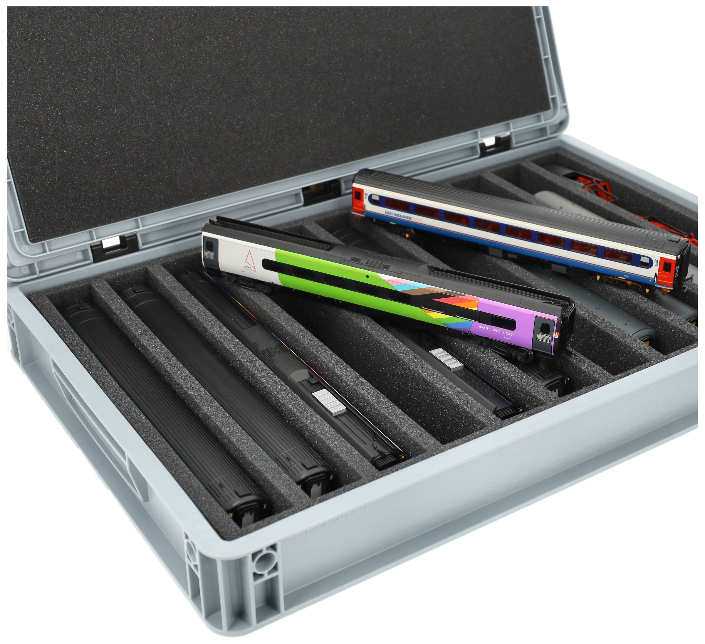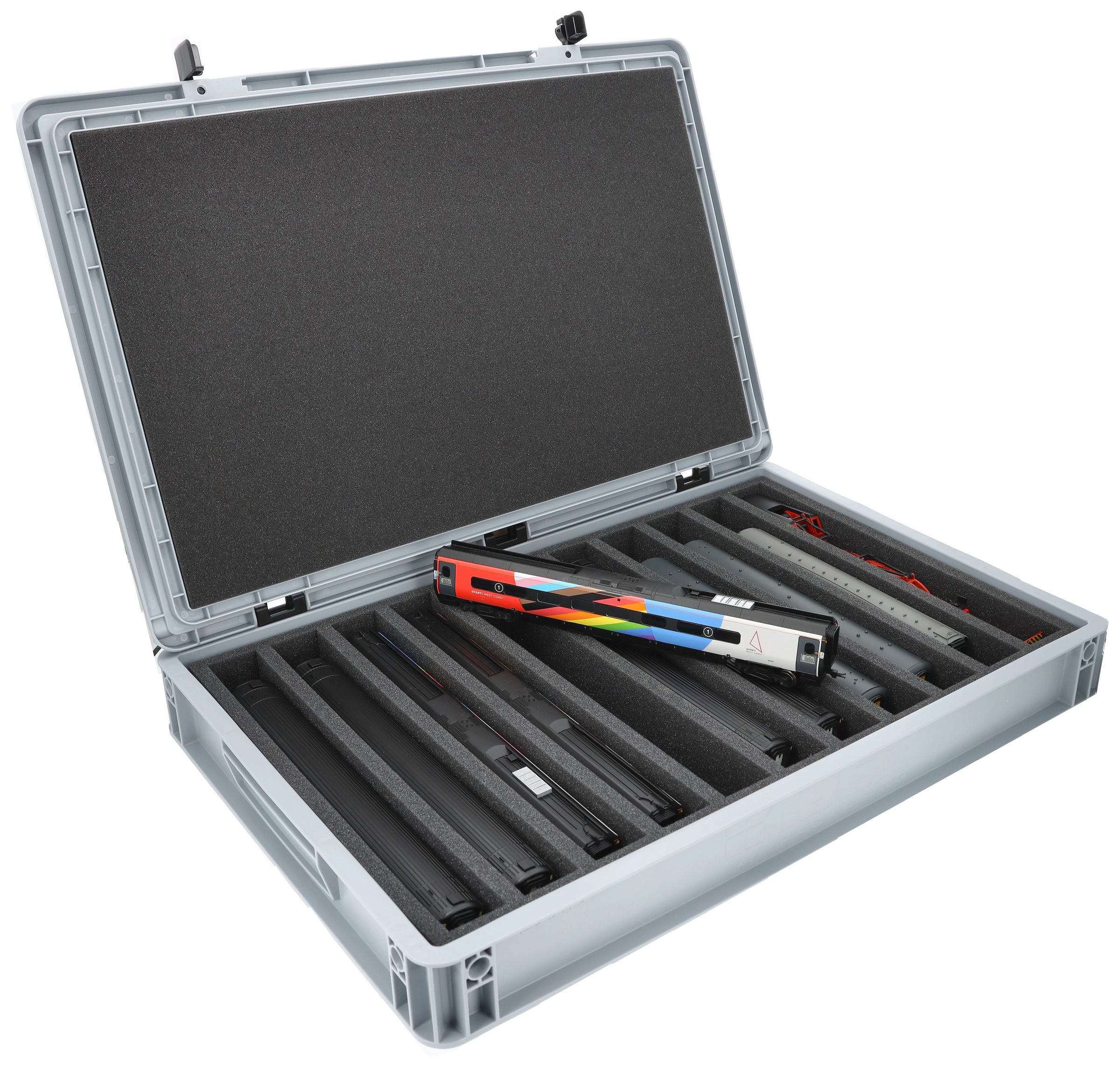 The 11 equal-sized compartments (each approx. 340 x 38 x 55 mm) are specially designed for 00 scale models. Depending on their length, several wagons or locomotives can be placed side by side. The exact fit ensures that the models are securely fixed and do not slip during transport.