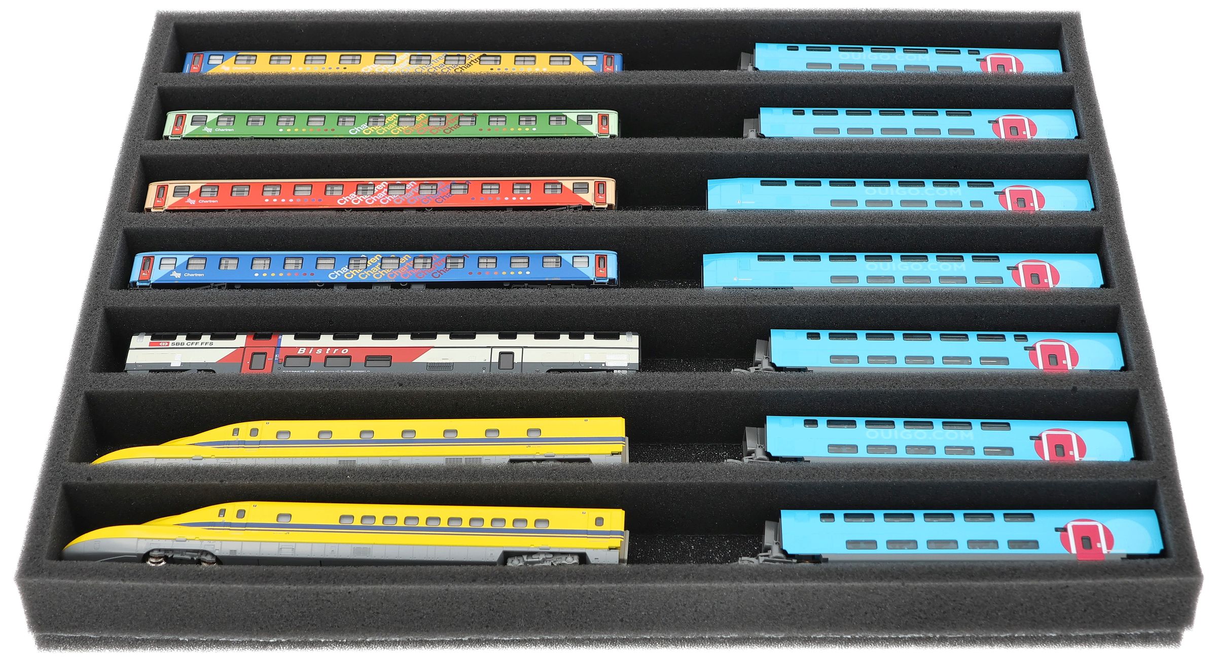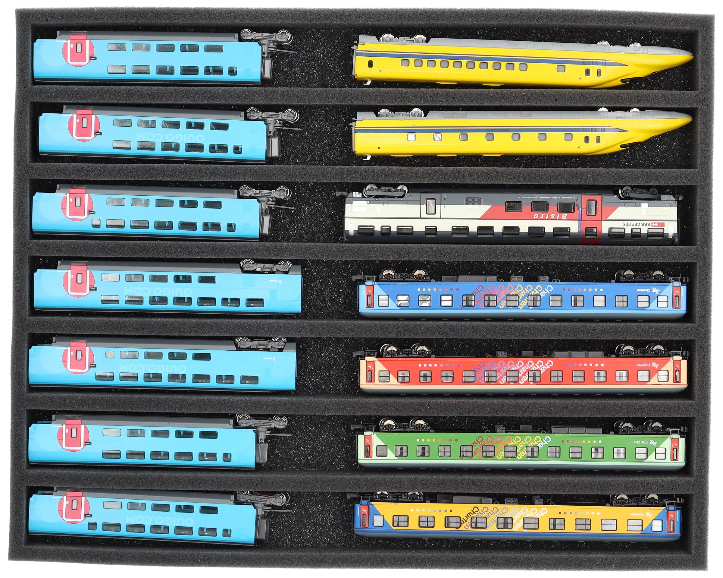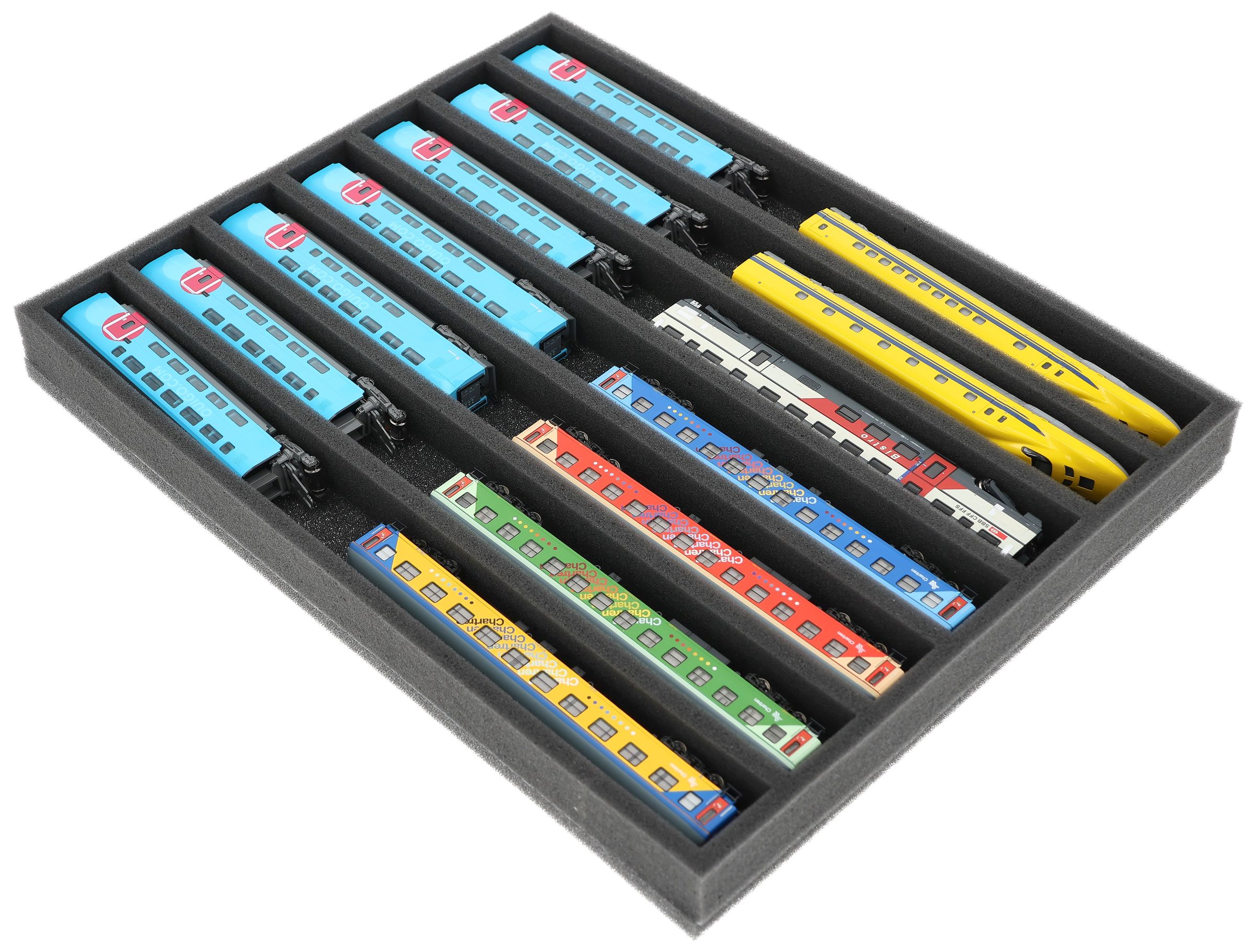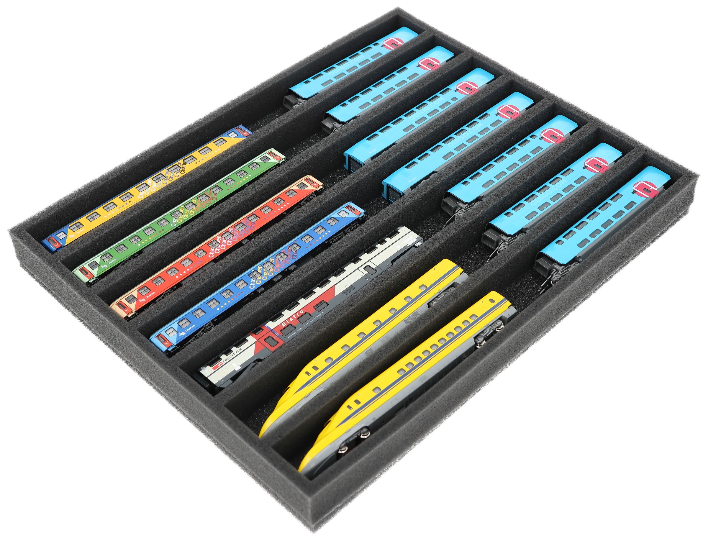Soft, comfortable and safe! Foam insert for railways in gauge N. The wagons and locomotives are stored on the side. So you can recognize your favourite immediately.