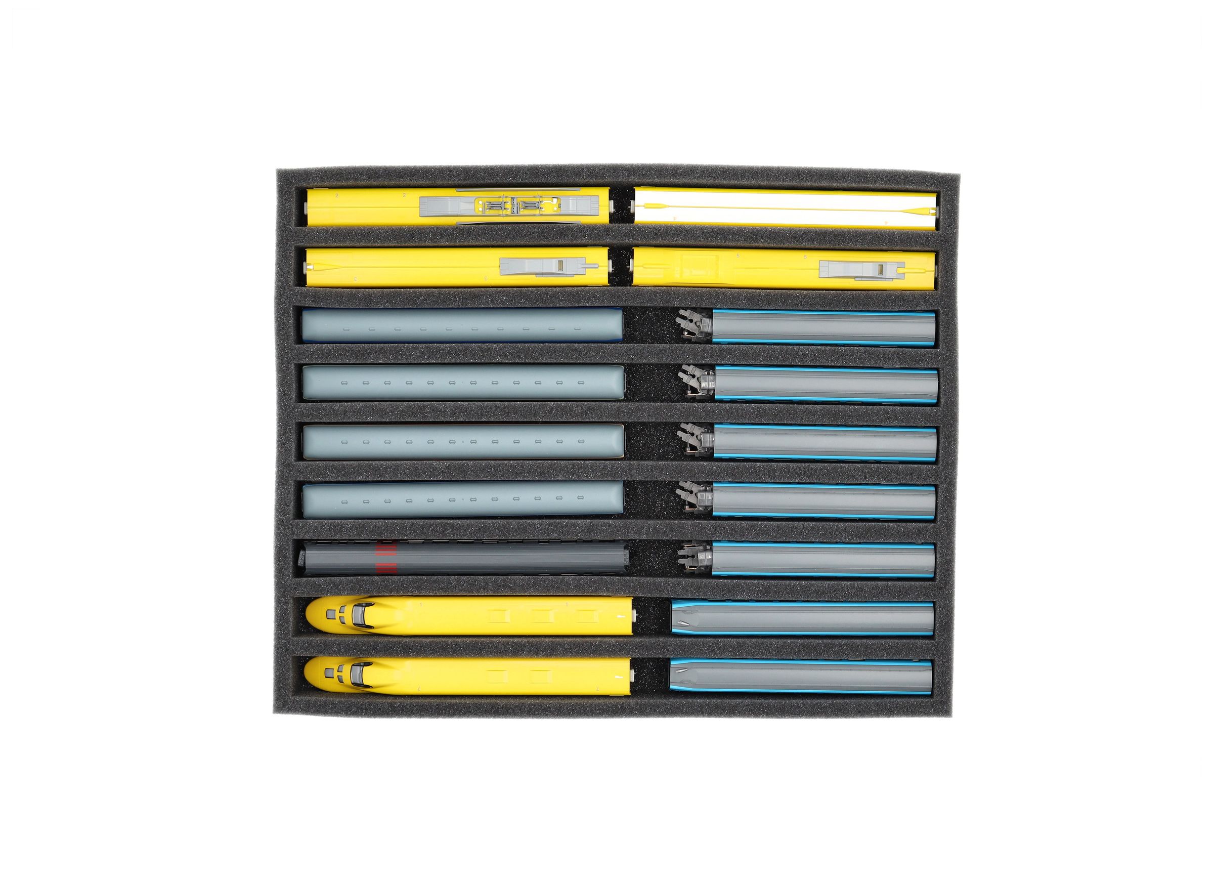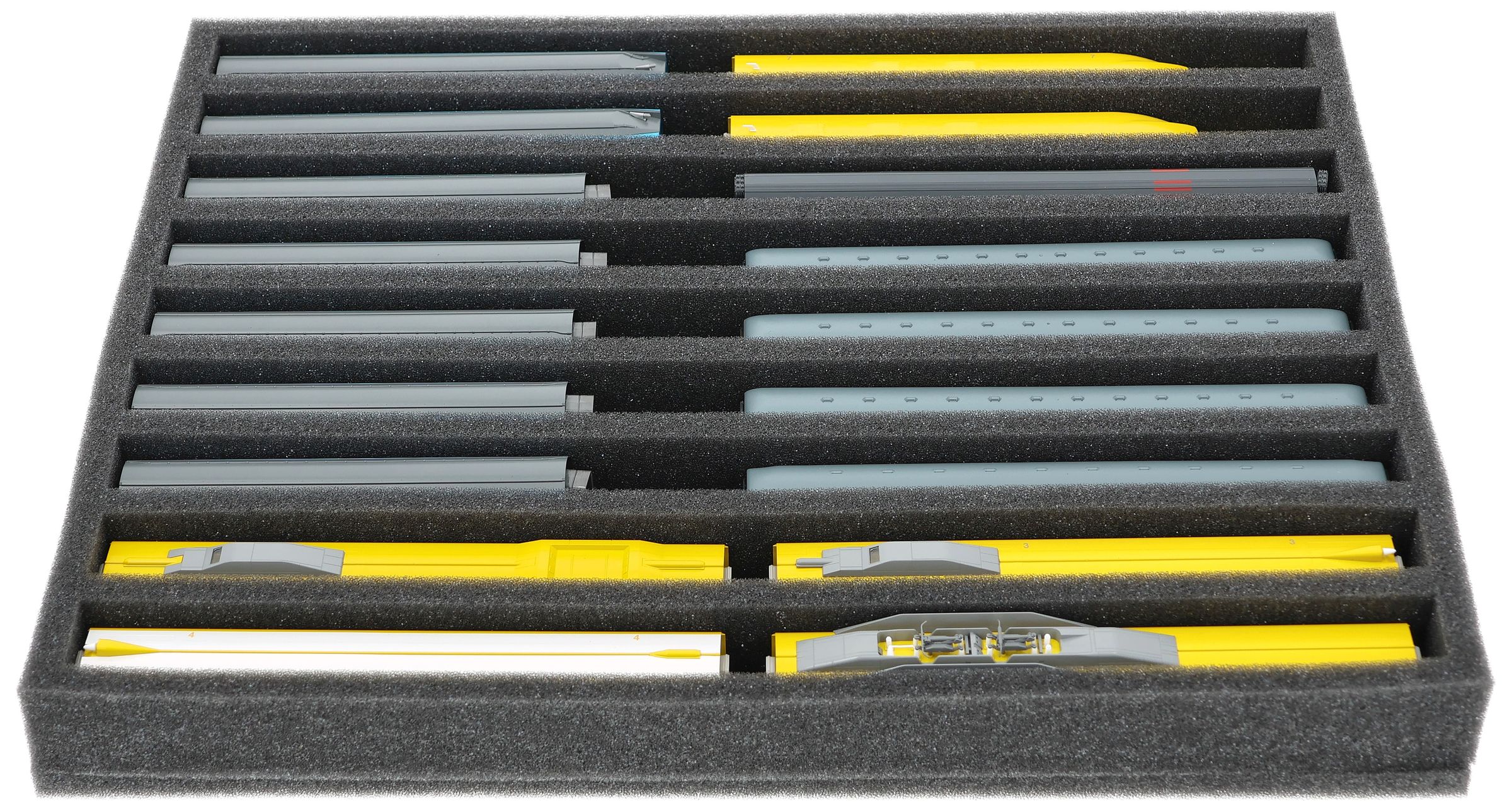 To store and transport the models reliably, we offer suitable foam spacers (HS025A002)! This prevents the individual locomotives, wagons or vehicles from colliding during transport or the individual models from coupling up unintentionally. It is best to order a set of inexpensive spacers at the same time.