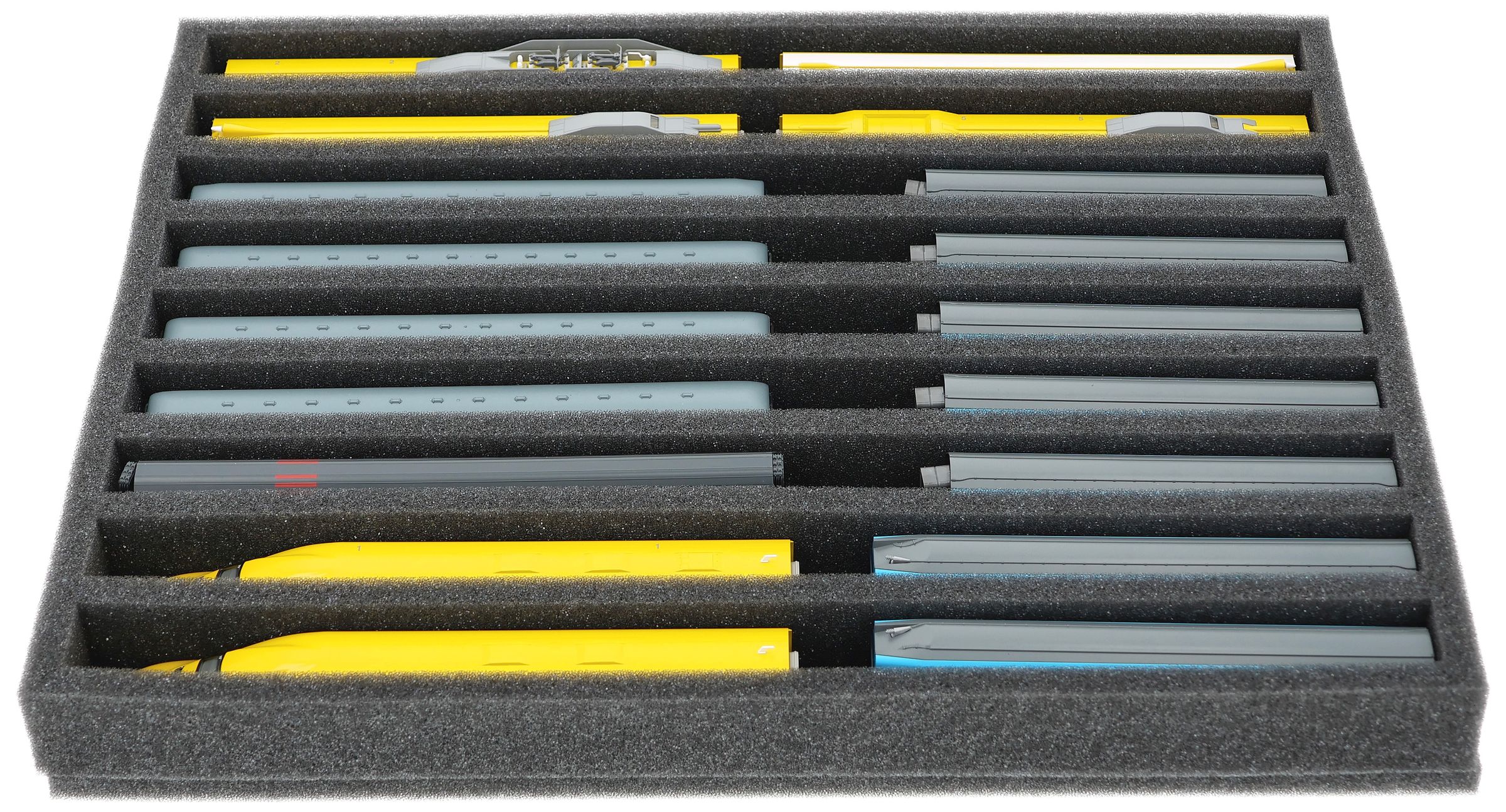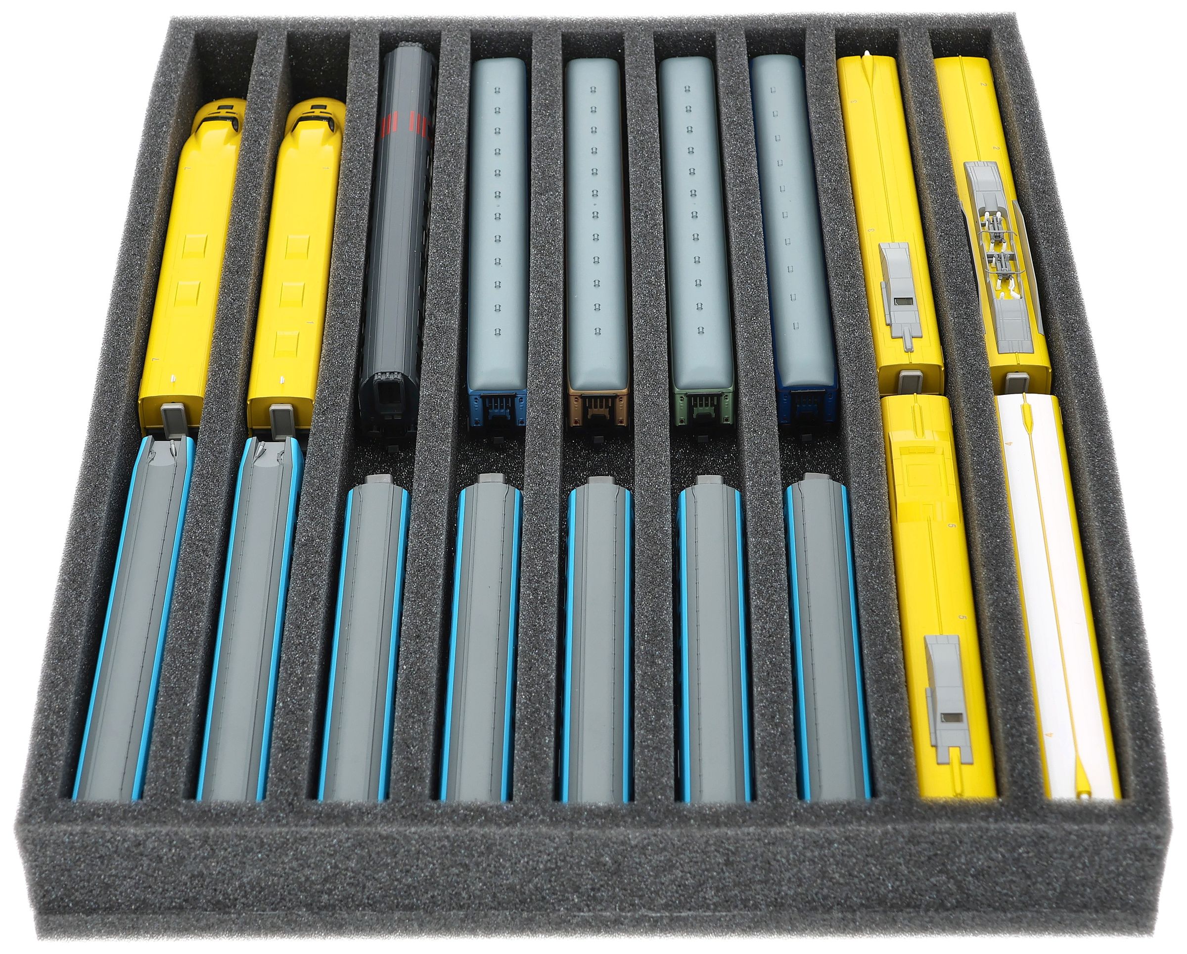 Soft, comfortable and safe! Foam insert for railways in gauge N. The wagons and locomotives are stored standing.
