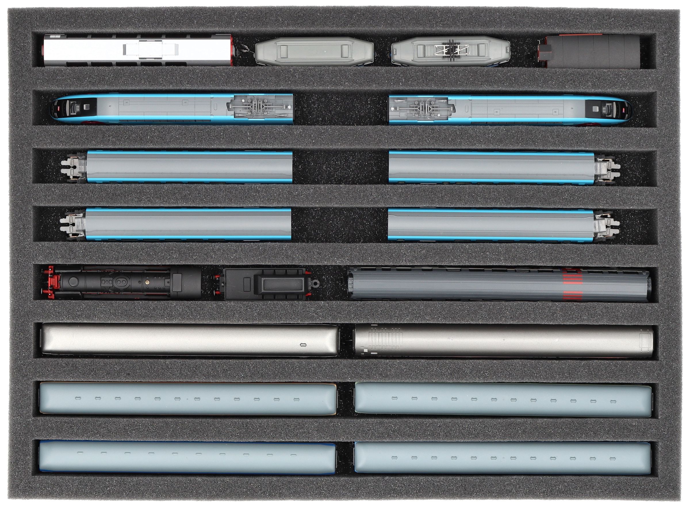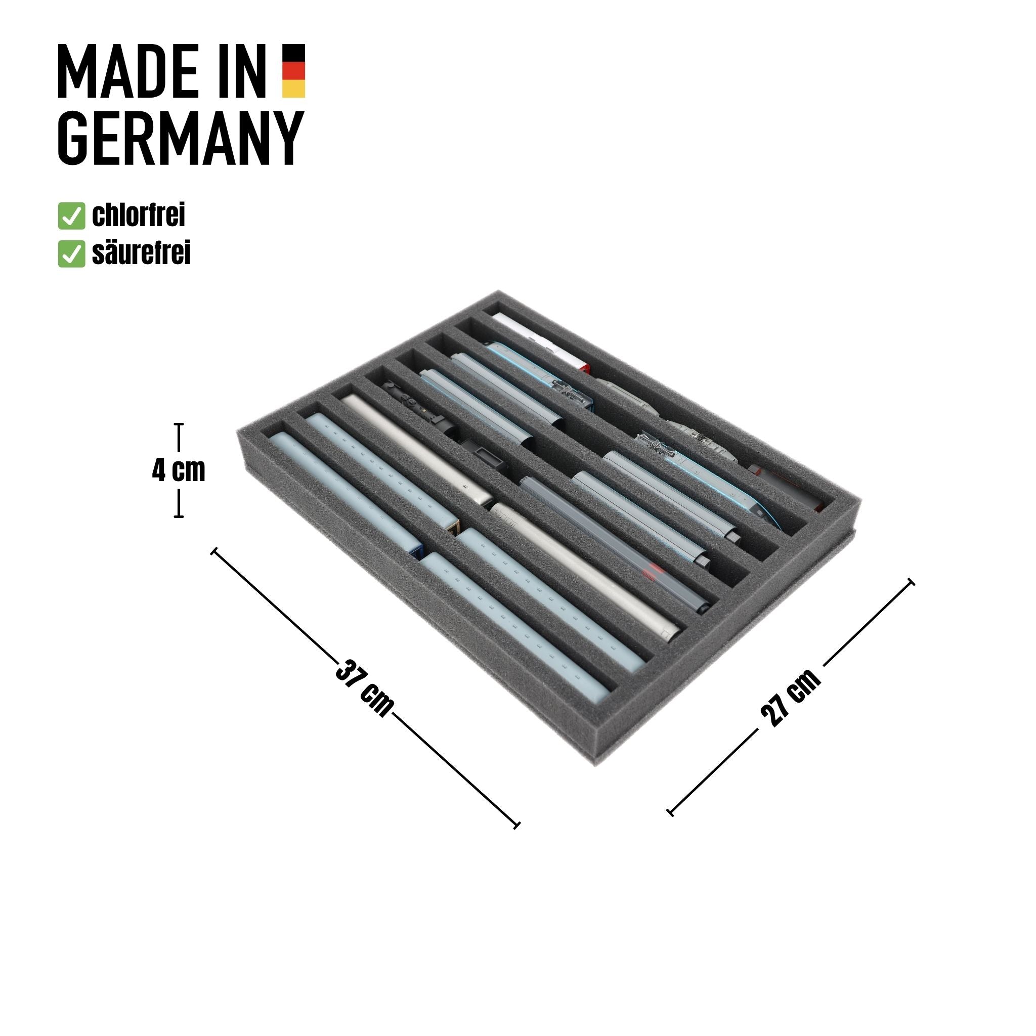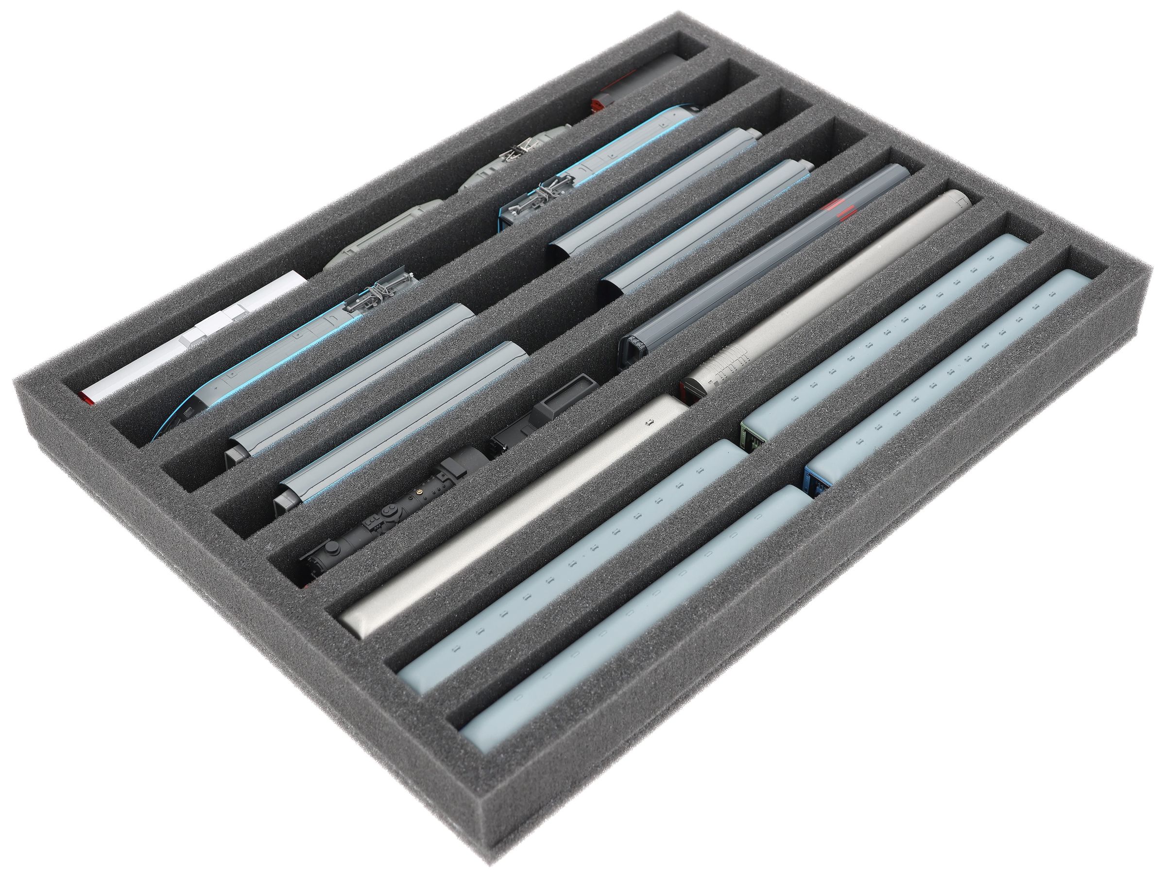 Whether for transport to exhibitions, module meetings, or safe storage on shelves at home, this insert keeps your N scale locomotives and cars reliably protected. The 8 compartments hold the models upright and shield them from bumps and scratches.