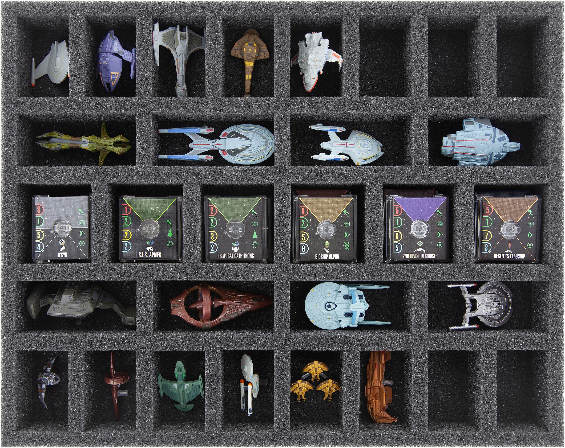 This foam tray has 30 differently-sized compartments for the safe storage of 24 smaller Star Trek Attack Wing ships including bases.