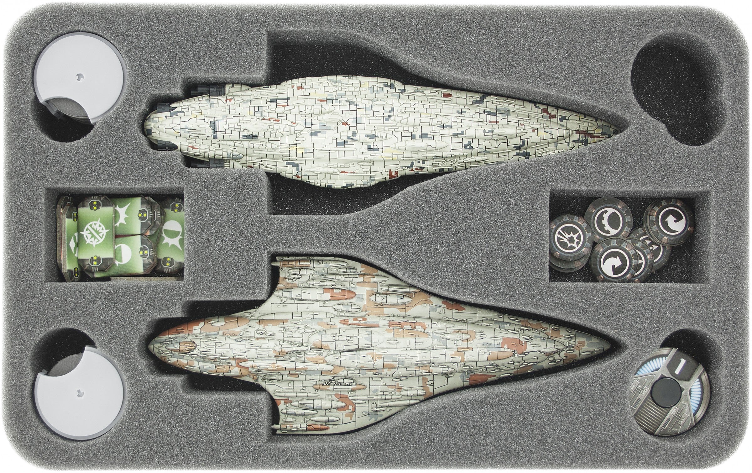 Especially for the Star Wars Armada Wave IV foam tray. There is enough space to store two MC80 Liberty type Star Cruiser and/or Wave 2 Home One! In addition, there is enough space for 2 Commando and Speed Dials.
