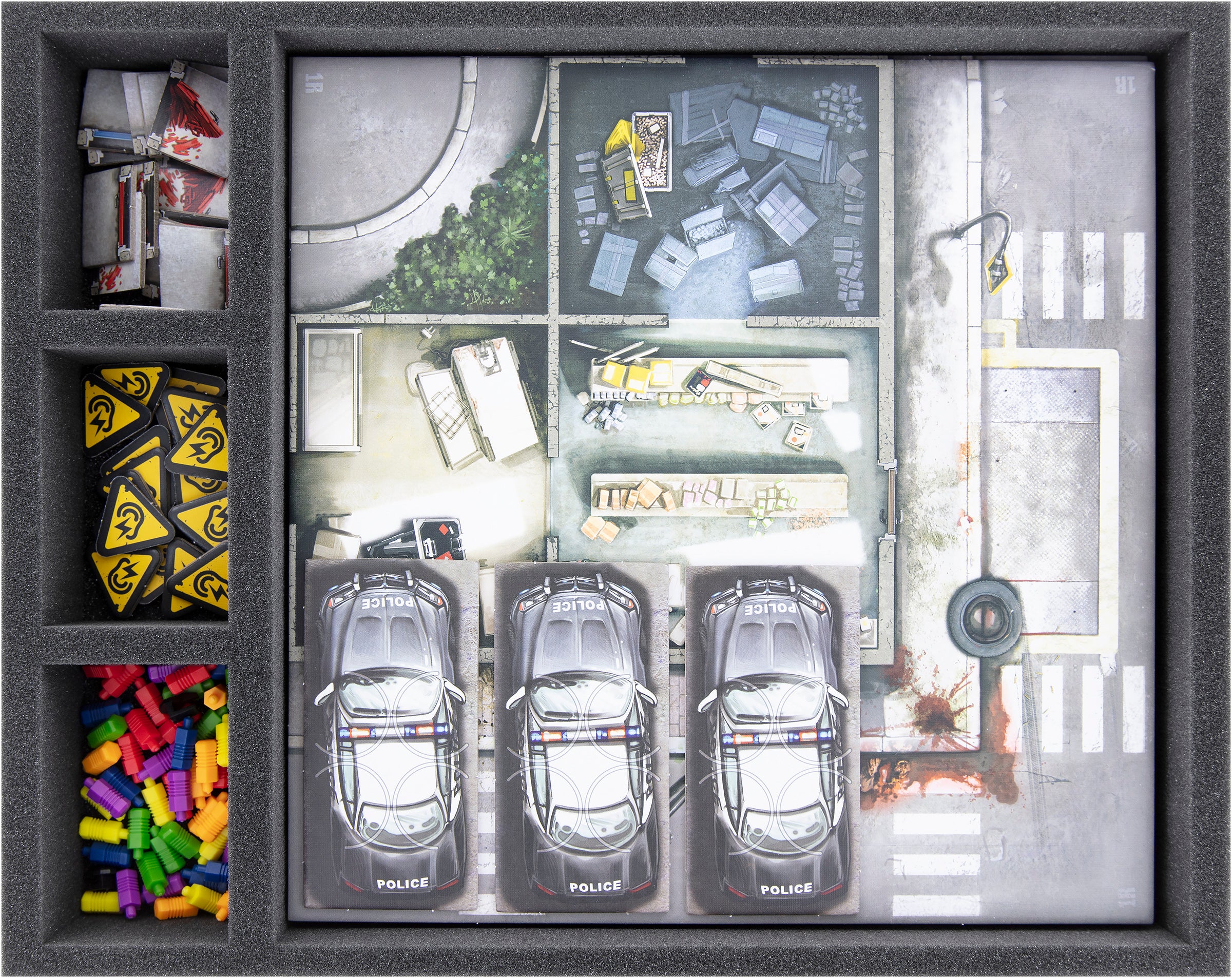 This Full-Size foam tray has a large compartment that holds up to 20 Zombicide tiles. The foam optimally protects the edges from wear and tear during storage and transport.