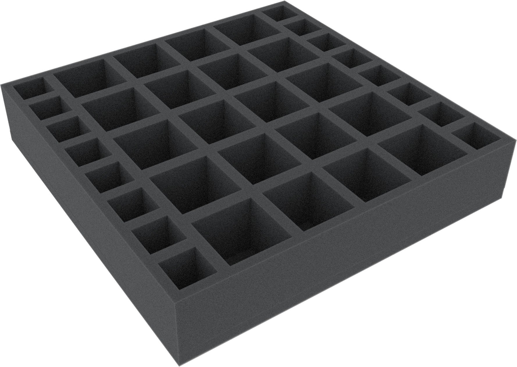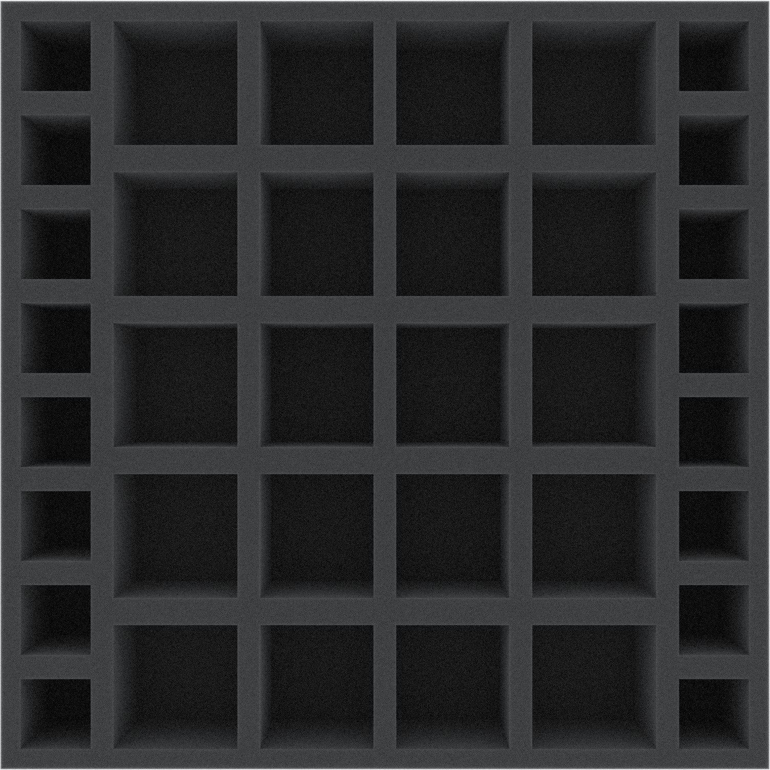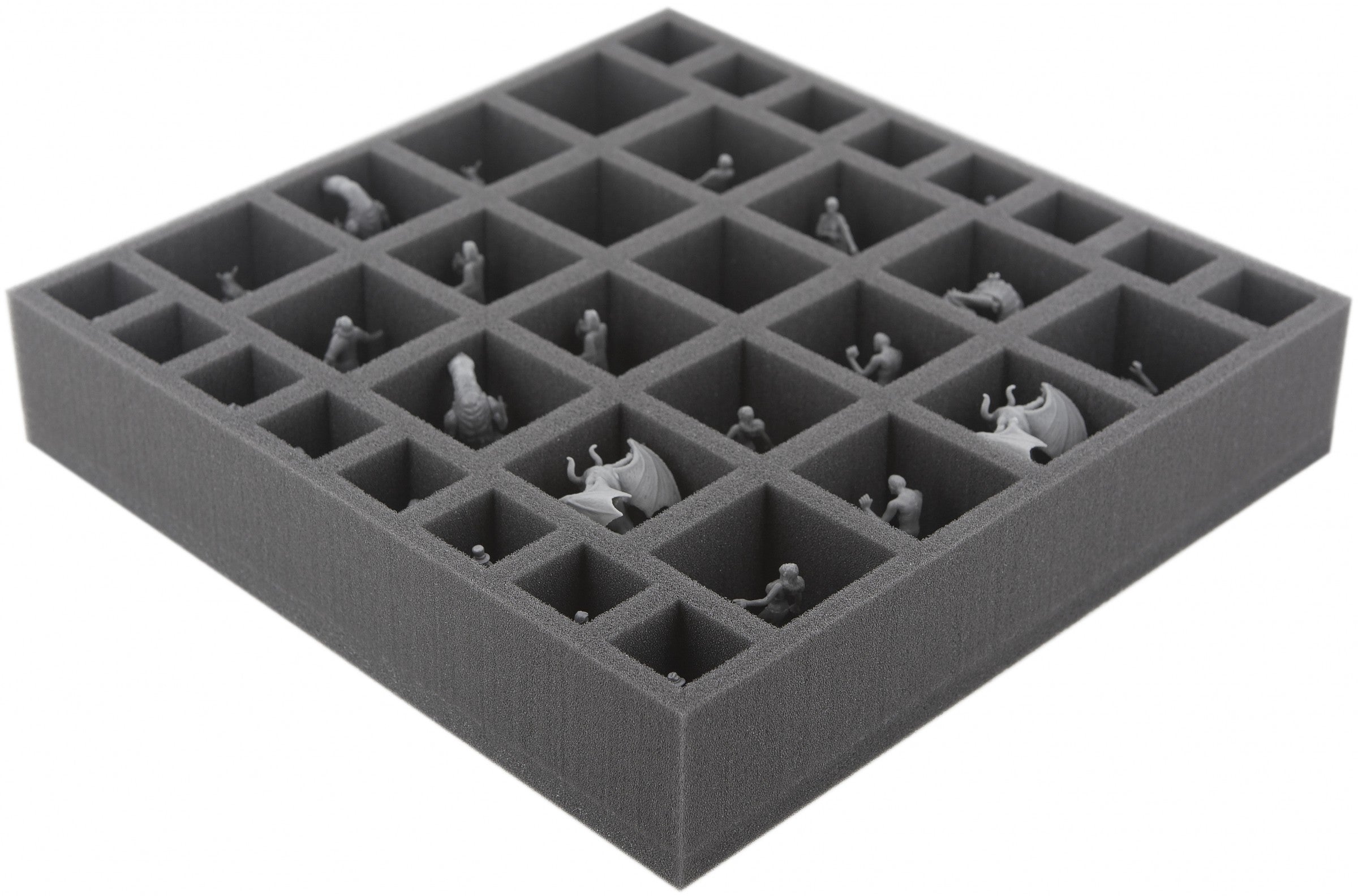 36 cut-outs for heroes and small monsters from the two expansions for Mansions of Madness Second Edition. The small miniatures of "Recurring Nightmares" and "Suppressed Memories" fit into the foam tray. The foam insert fits perfectly into the original board game box, or into the Feldherr box LBBG.
