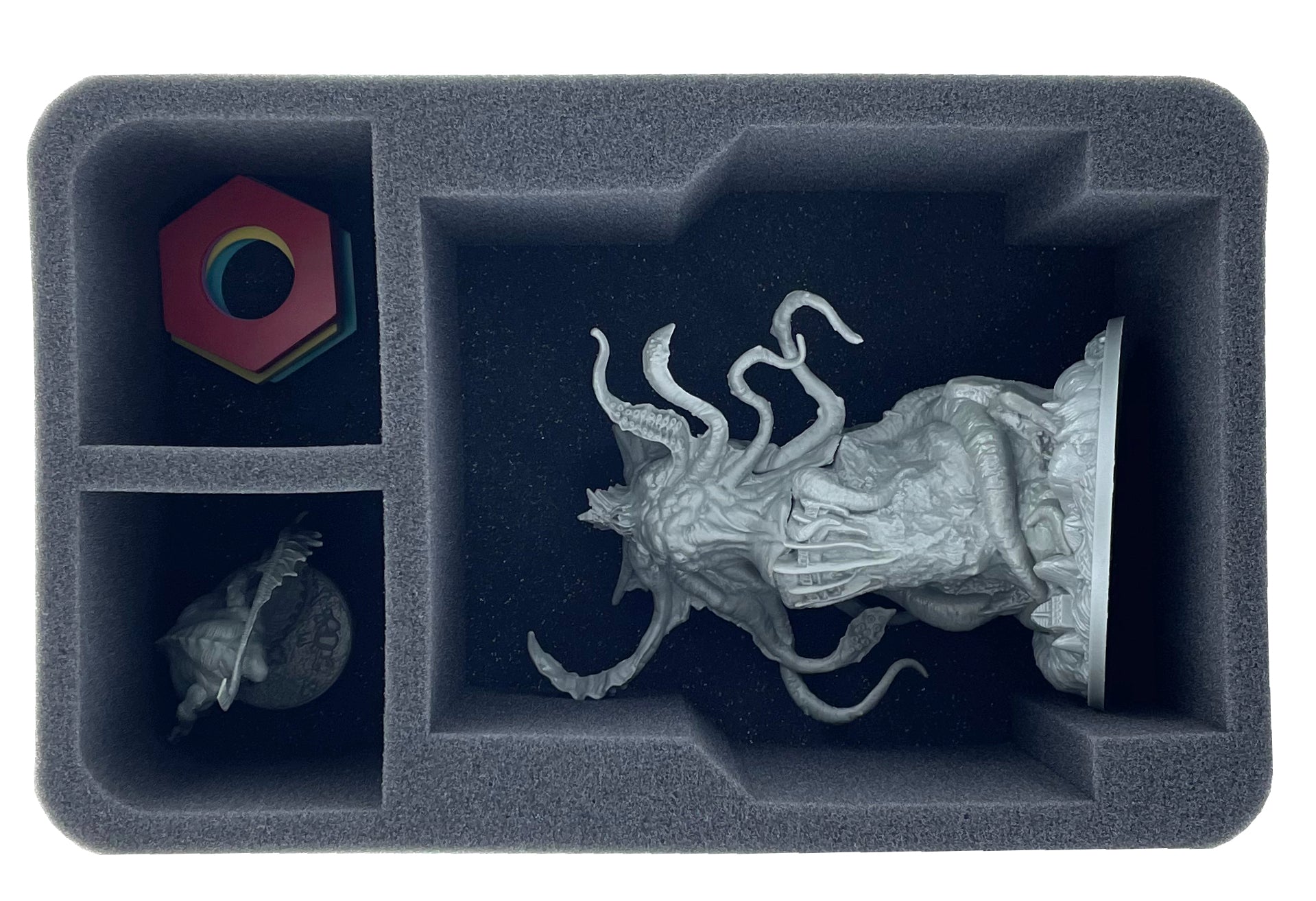 • 1 Half-Size foam tray with 3 compartments for a large miniature like the Avatar of the Old One, larger miniatures like Abhorrent or Wyrm + game material like clip-on bases (HSDV110BO)