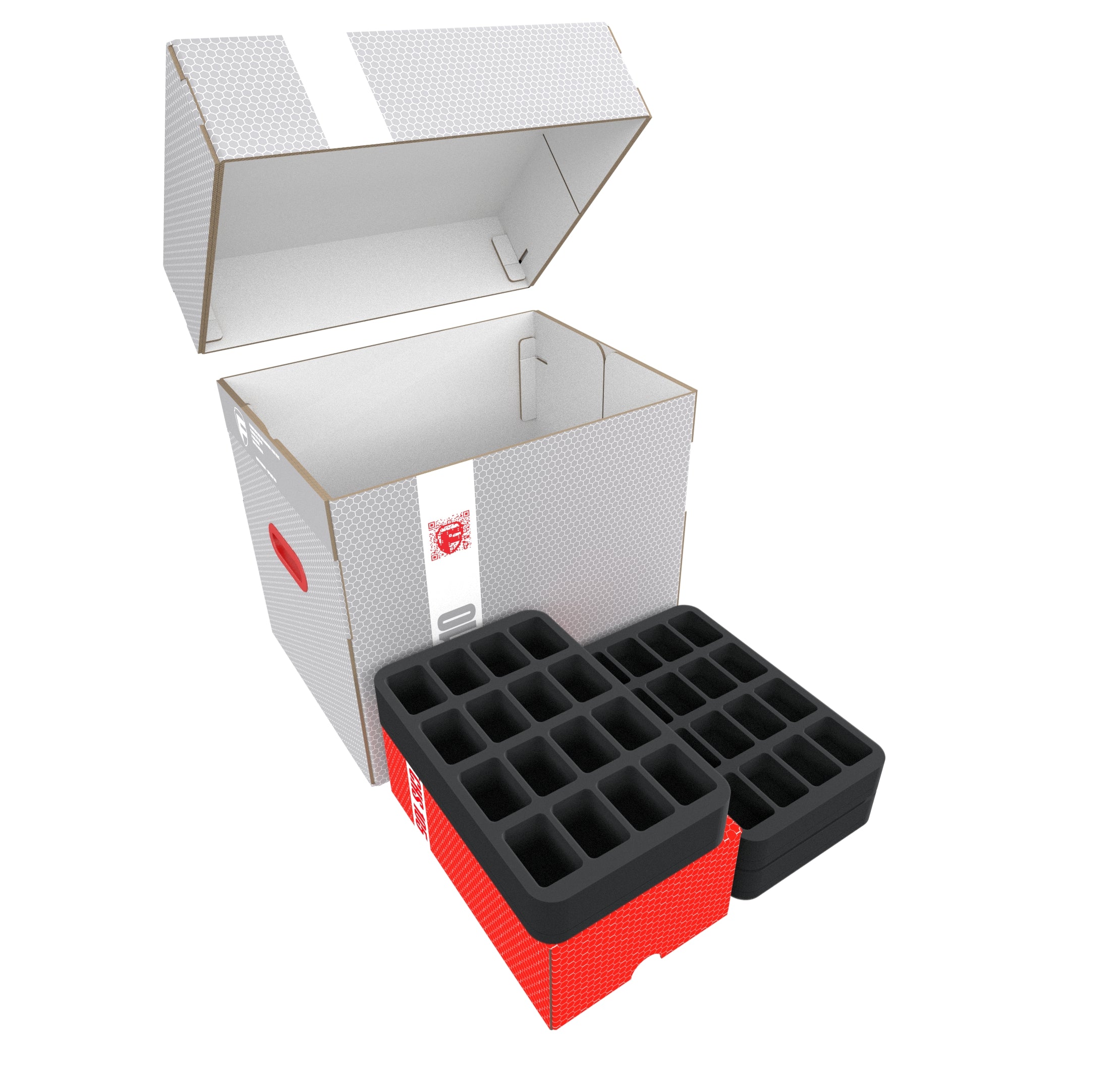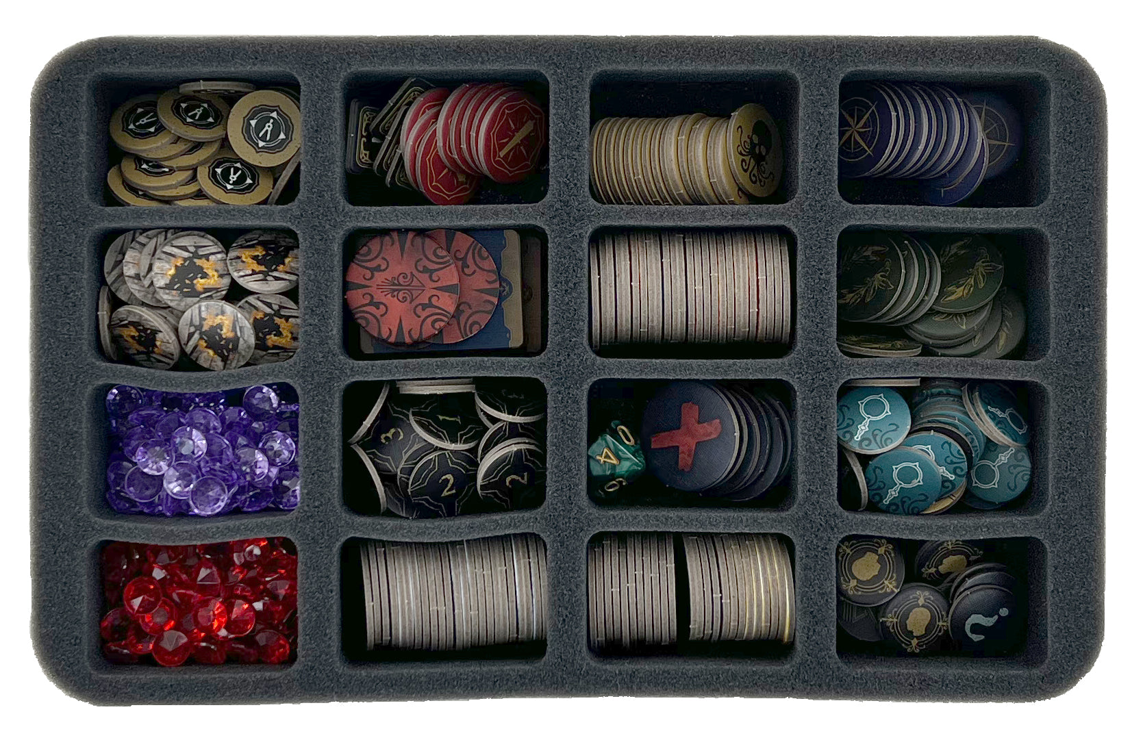 While you sort dice and clip bases into the free compartments of the foam inserts, a Half-Size foam insert with 16 compartments is available for the majority of your tokens. You decide the way you sort your game material there.