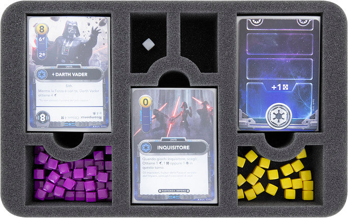 For your playing cards and the game material, we have packed a Half-Size foam insert with seven compartments of different sizes into the case.