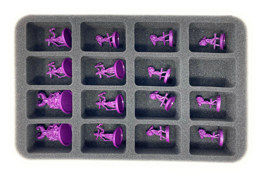 - 1 Half-Size foam tray with 15 compartments for miniatures like alternate Beowulf, alternate Drachentöter, Mascots, and Kickstarter Exclusives like Skybound (HSMEDO065BO)