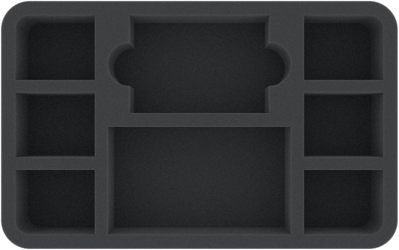 - 1 Half-Size foam tray with 7 compartments for miniatures like alternate Freischütz and Marduk + game cards and game materials (HSMEQO050BO)