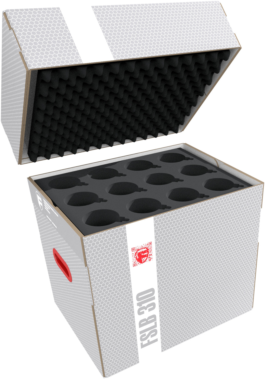 The Storage Box FSLB310 is made of coated, double-walled cardboard. This makes it not only pleasantly light but also particularly tear-resistant and stable. With the matching foam trays, miniatures and game material can be stored safely and dust-protected and can also be transported effortlessly with the plastic carrying handle. To make it easier to store and remove the foam mats, one side of the box can be opened completely. The trays are either inserted from above or simply slid into the box from the side.