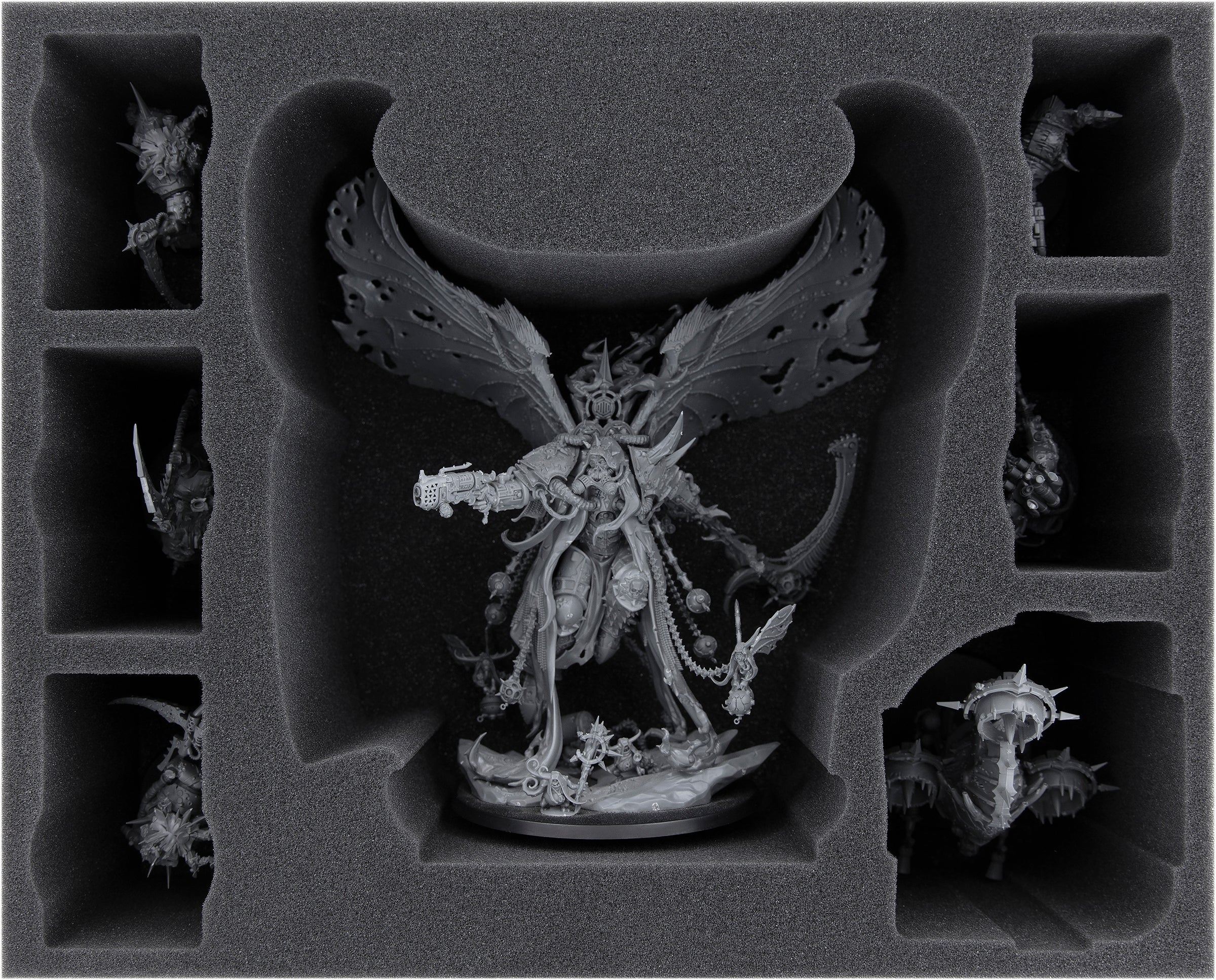 The 120 mm high Full-Size foam tray provides optimum protection for Mortarion with a compartment tailored exactly to the Death Lord. His massive wings, the scythe and the Nurgling drones will remain intact in the future.