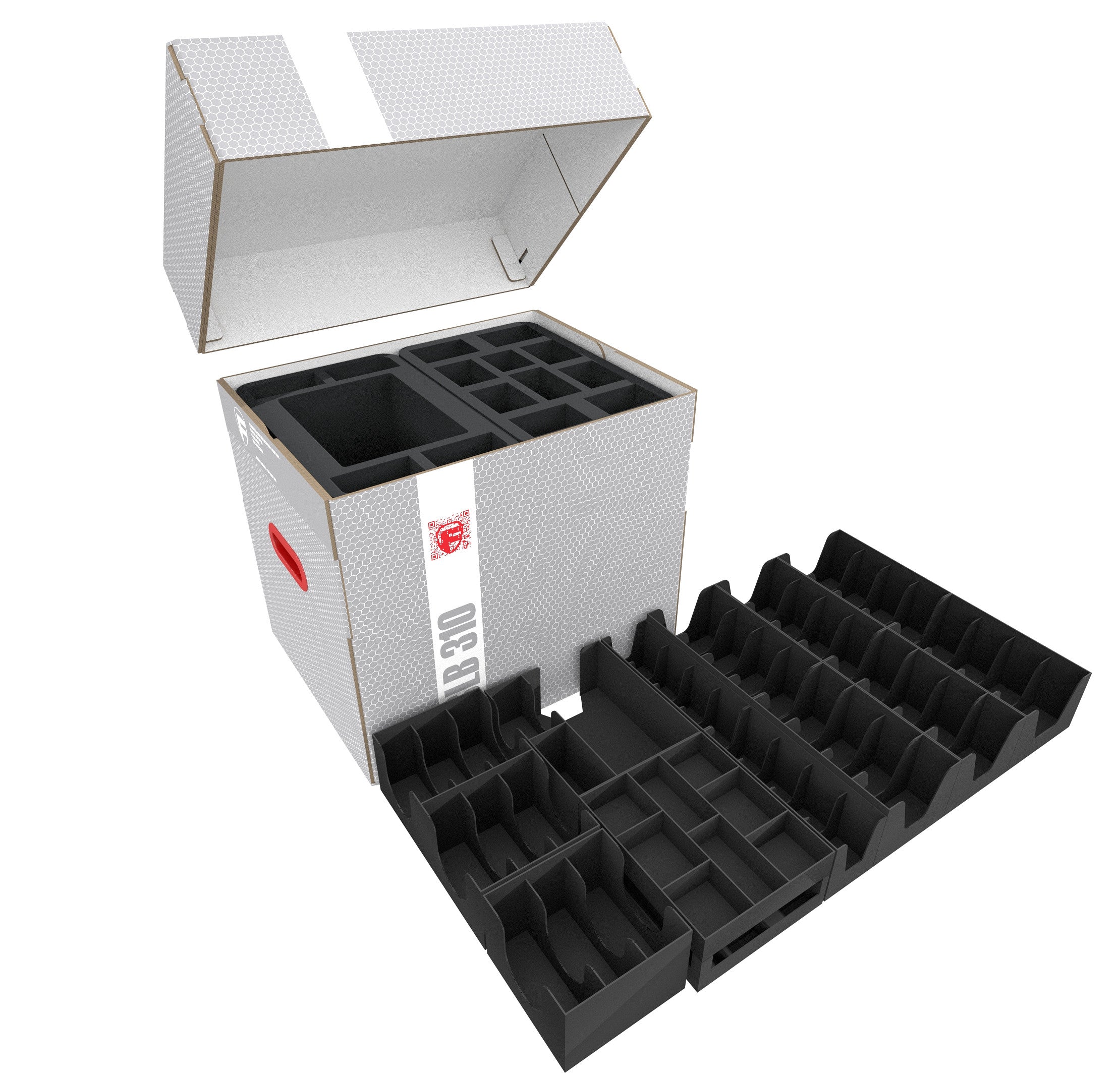 The Storage Box FSLB310 is made of coated, corrugated cardboard. This makes it not only pleasantly light but also very tear-resistant and stable. The attachable lid reliably protects the contents from dust and other external influences. The appropriate foam trays, miniatures, game material, and all other goods can be stored safely - and conveniently transported with the two plastic-reinforced carrying handles on the sides.