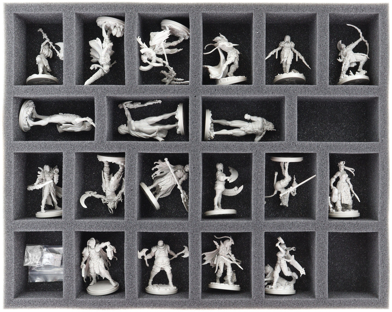 - 1 Full-Size foam tray with 22 compartments for expansive standard miniatures like Savage Bone Eaters, Champion of the Goblin, Neko Twilight Knight, Honorable Berserker, and models with similar dimensions (FSMEZZ050BO)