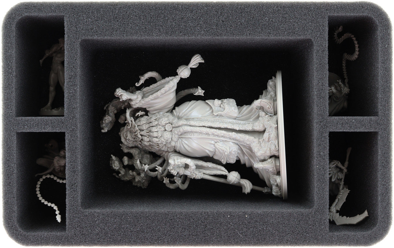 - 1 Half-Size foam tray with 5 compartments for large miniatures like Atnas the Child-Eater and bulky miniatures like Savage Bone Eaters, and models with similar dimensions (HSMEVE105BO)