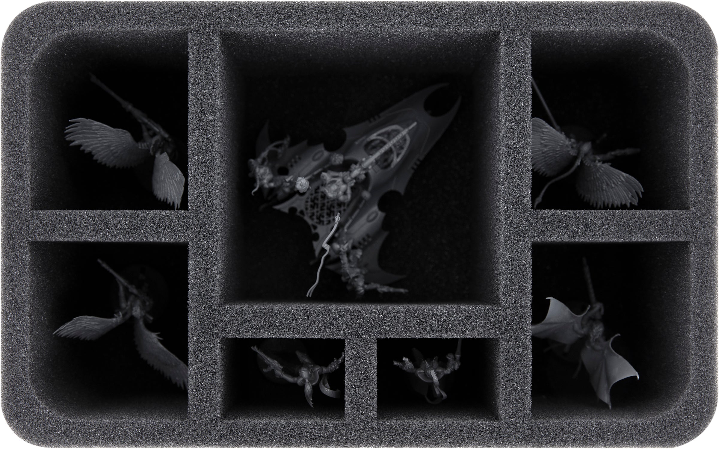 Led by the greatest warrior the arenas of Commorragh have ever produced, the Drukhari rush into battle. Knowing full well that insubordination will result in a gruesome death. In the 60 mm high insert, Lelith Hesperax finds a suitable compartment to recover from the strains of battle. The remaining compartments can accommodate bulky miniatures, like the Scourges.