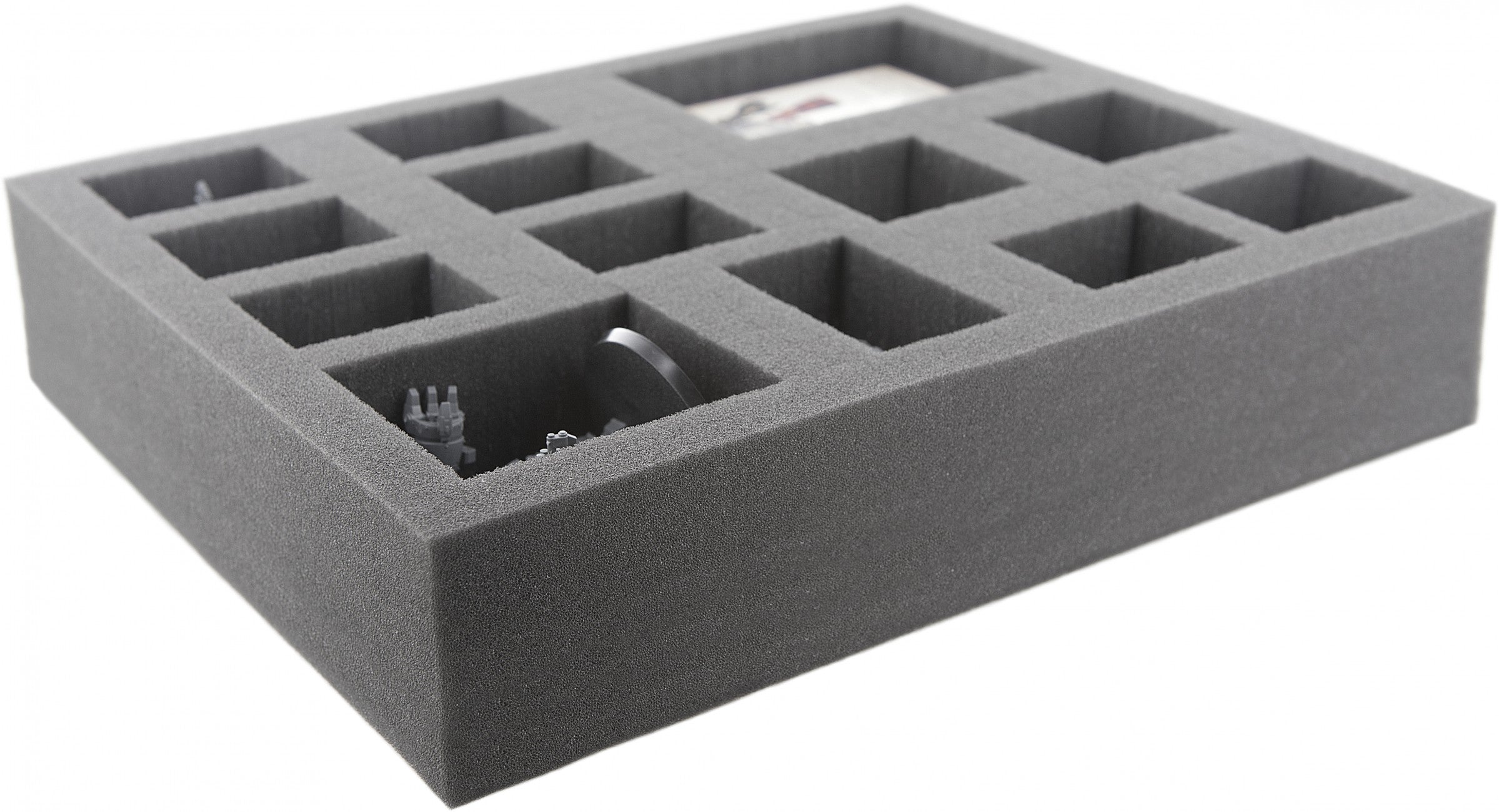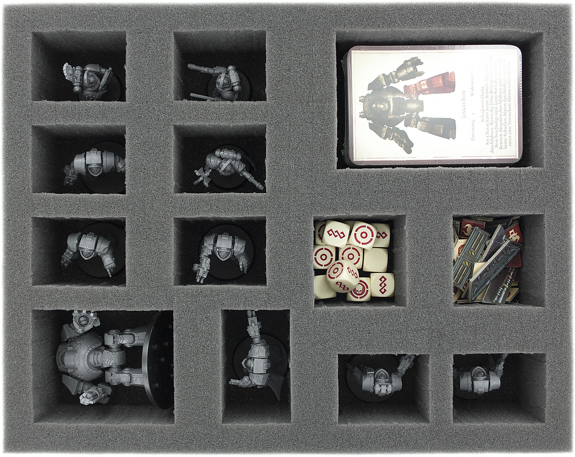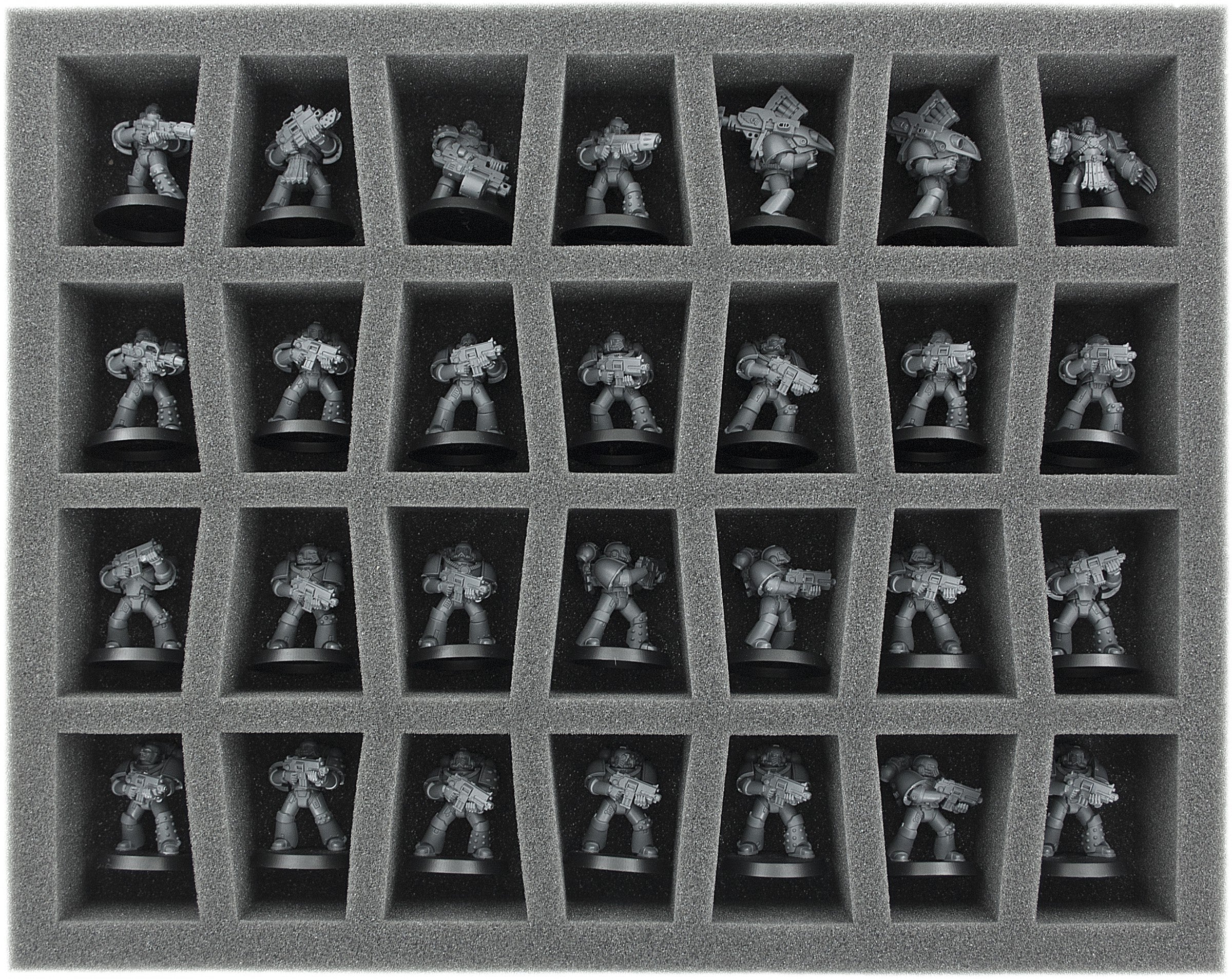 60 mm Raster Schaumstoffeinlage: Das perforierte, vorgestanzte Raster (14 mm * 14 mm) erlaubt das individuelle Anpassen der Schaumstoffeinlagen an die Miniaturen.