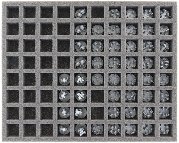 - 1 Full-Size foam tray with 80 compartments for infantry units like Legiones Astartes, Solar Auxilia Lasrifle Squads, and miniatures with similar dimensions (FSMEUM035BO)