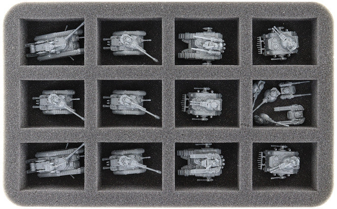 - 2 Half-Size foam trays, each with 12 compartments for armored vehicles like Sicaran, Predator, Leman Russ Battle Tanks, and miniatures with similar dimensions (HS040I012BO)