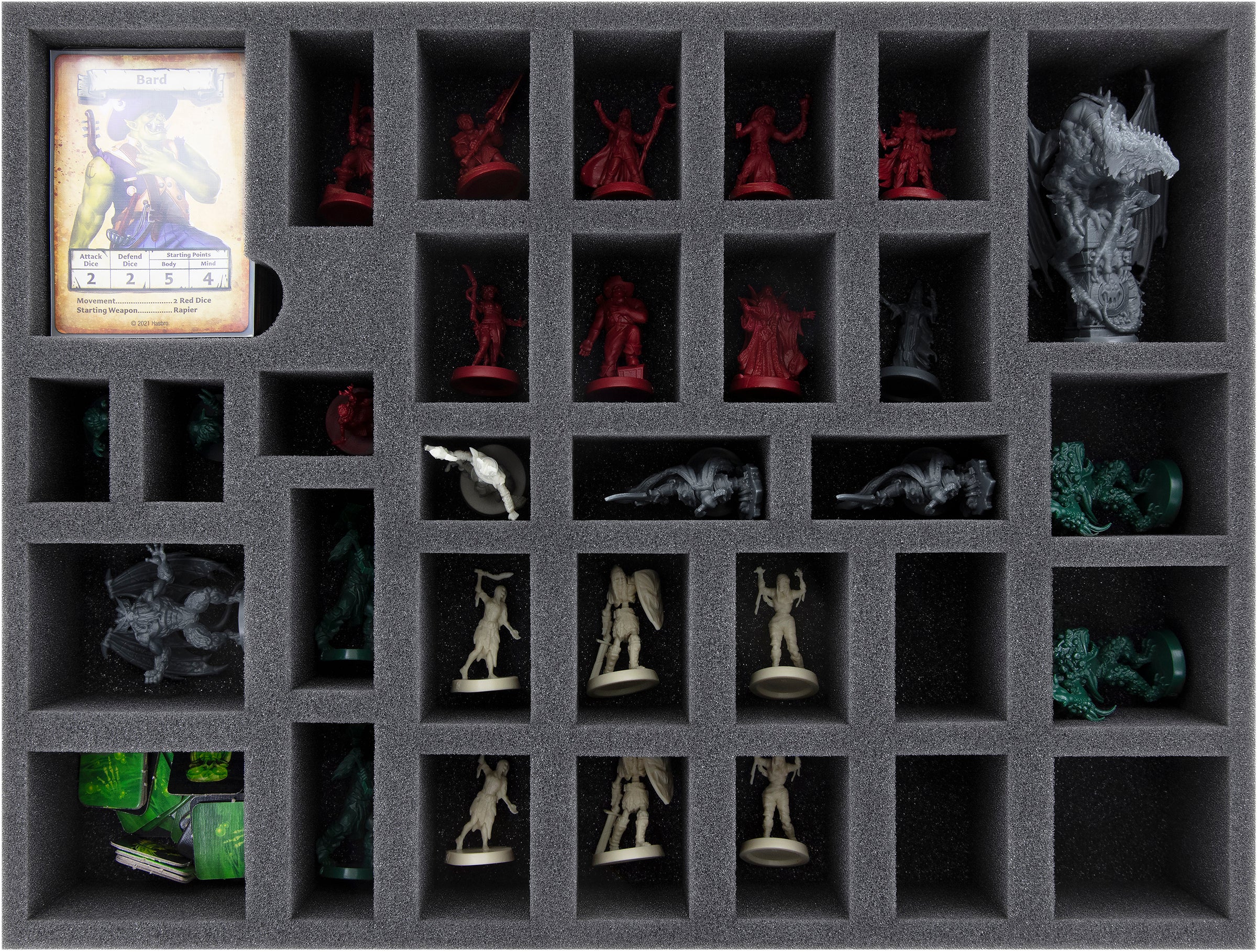 Whether bard or dragon, each miniature gets a custom-fit compartment. Thanks to this, your little treasures have a tight fit. Even if it should be a little bumpier during transport, they do not slip and remain in place.
