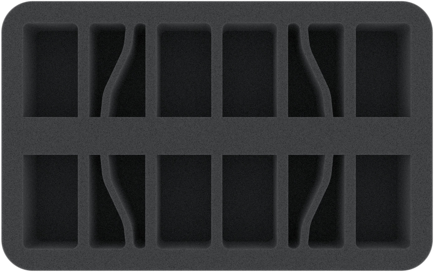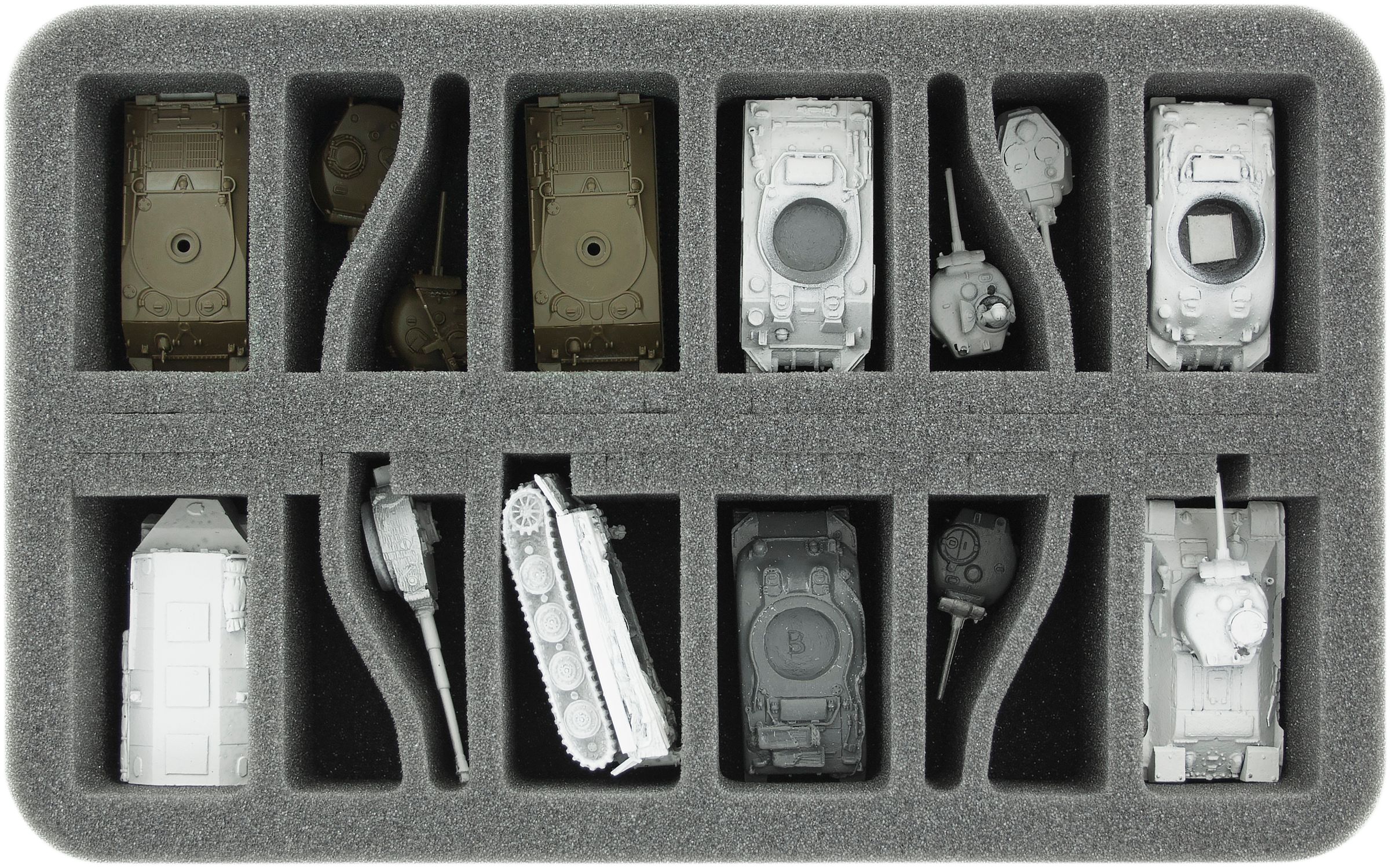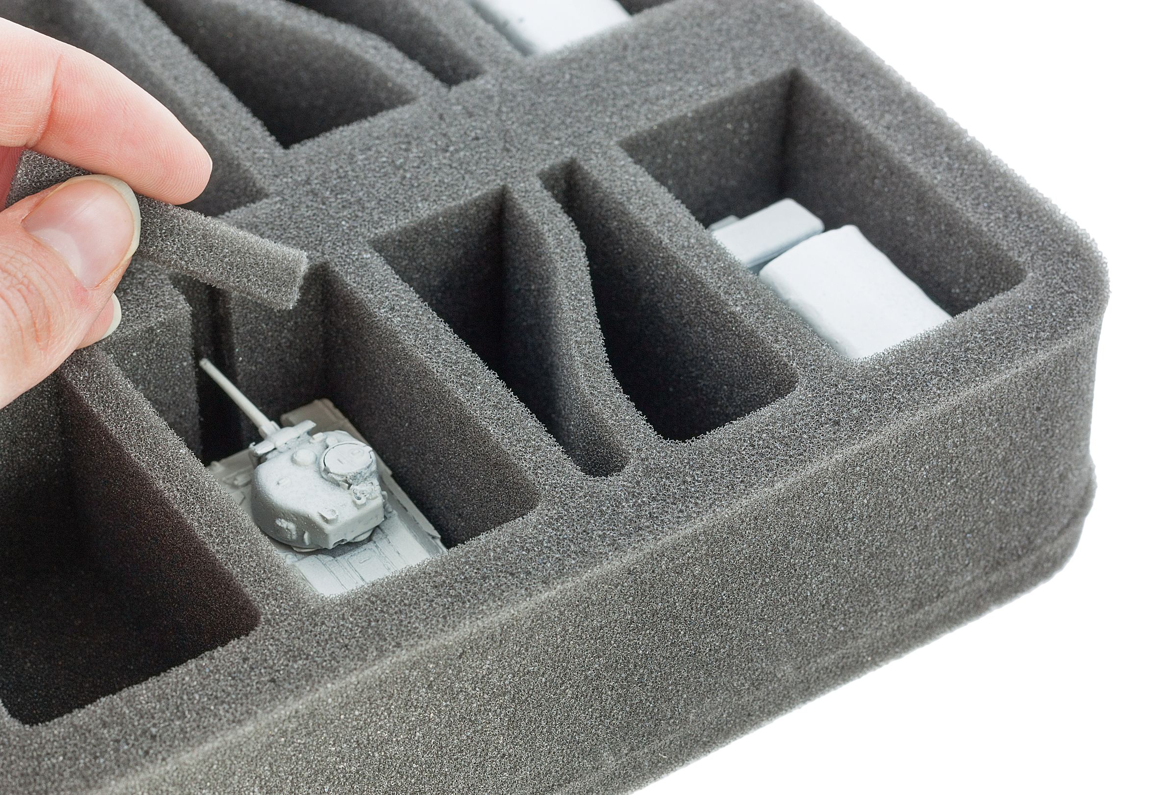 This Feldherr Half-Size foam tray has 16 compartments for the safe storage of 8 "Flames of War" tanks. The 8 large compartments will hold the tanks, the 8 smaller compartments with the curved sides are ideal for the gun turrets.
