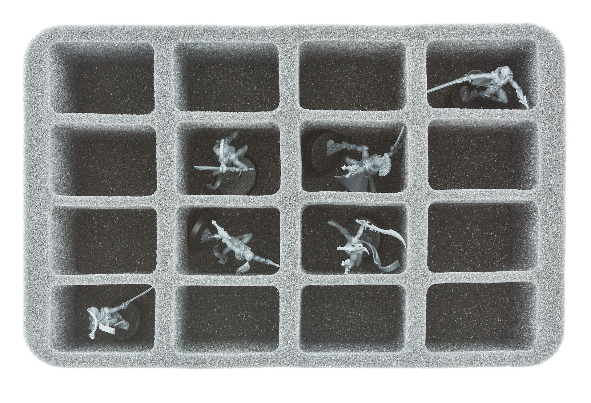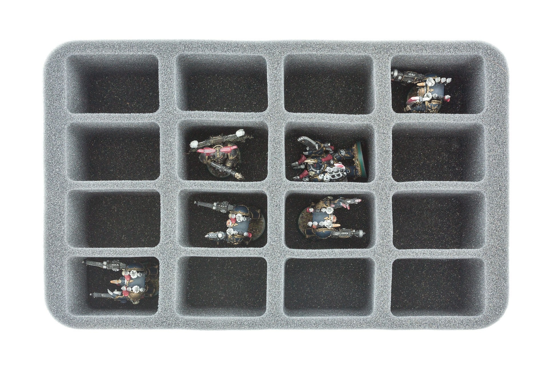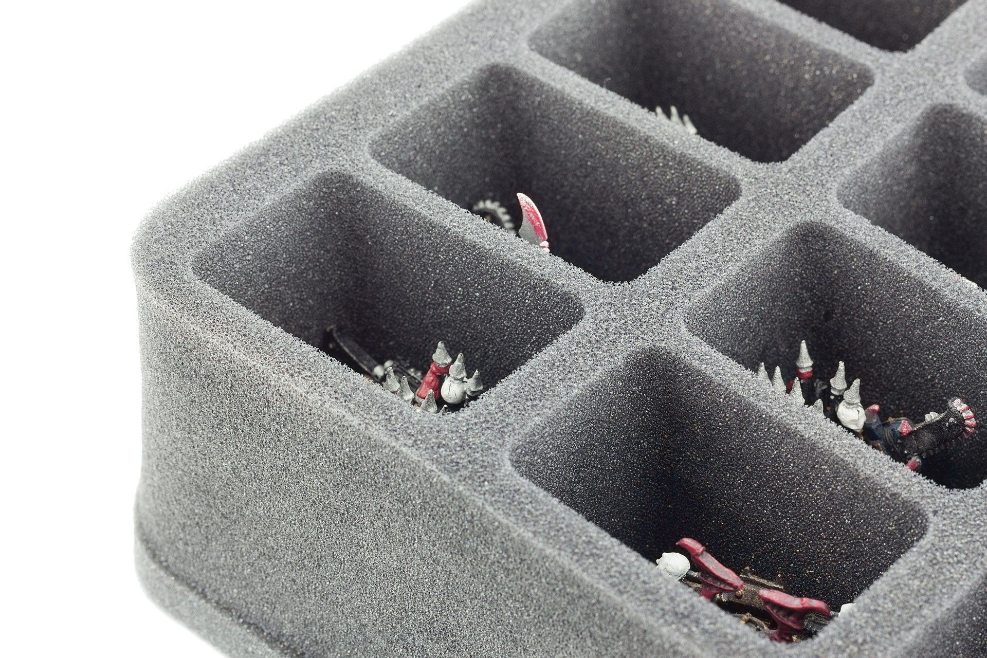 16 mittlere Fächer zum Transport von ausladenden Figuren - zum Beispiel Figuren mit sperrigem Zubehör (Musketen, Lanzen, Kettensägen, Flammenwerfer, etc.). Die Modelle könne auf Bases bis 35 mm Durchmesser / Kantenlänge stehen.
