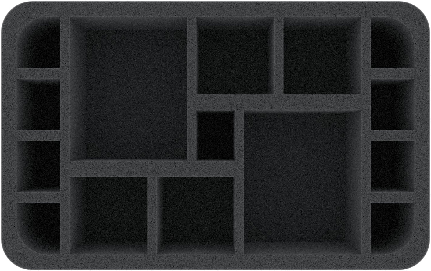 This Half-Size foam tray is divided into 15 compartments. It is particularly suitable for safe storage of miniatures in different sizes for various board games and tabletop wargaming systems. Game material (e.g. tokens, dice, tiles) and other small items can also be stored neatly and well protected here.