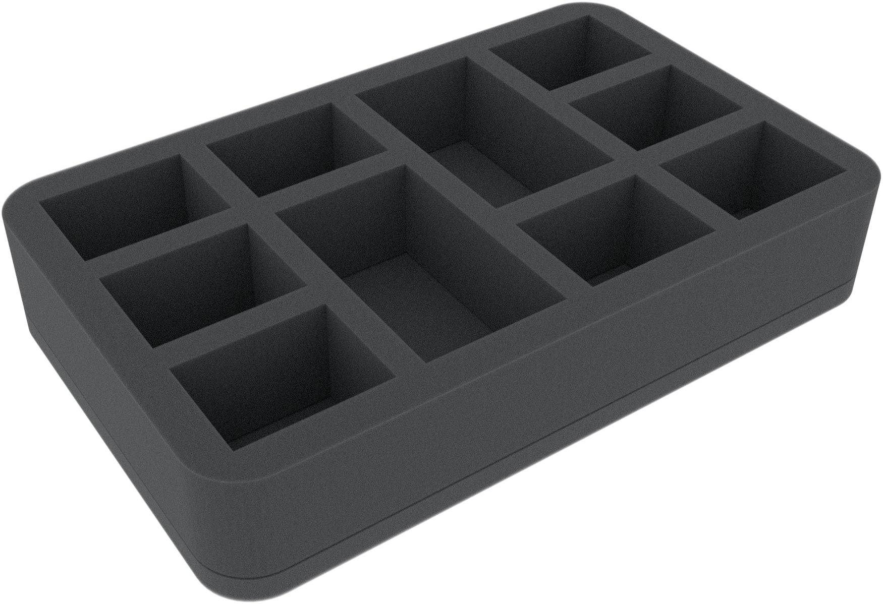 This Half-Size foam tray is divided into 10 compartments of the different sizes. It is particularly suitable for the safe storage of miniatures for various board games and tabletop systems. Game material or other small parts can also be neatly stowed here.