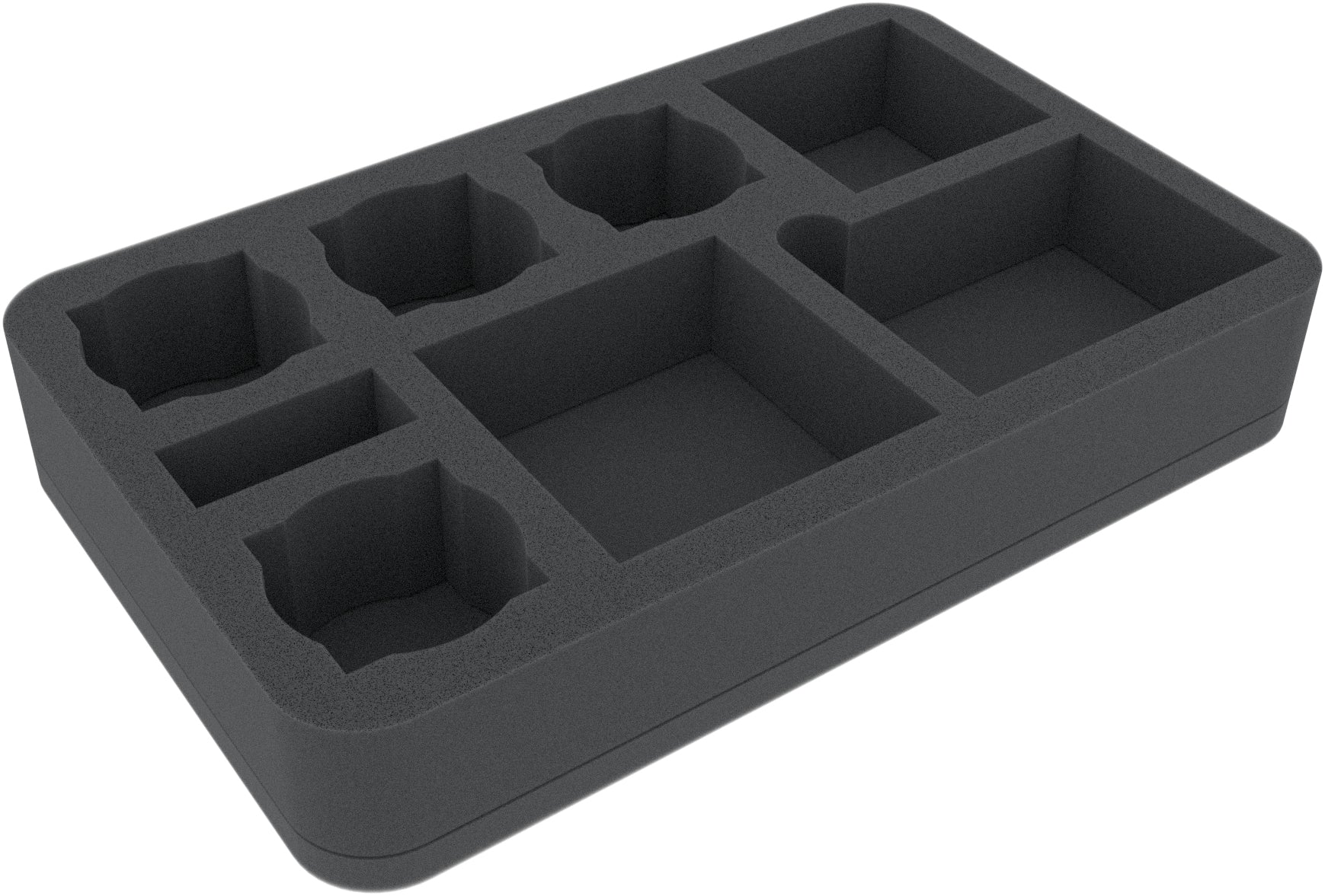 This foam tray features 8 compartments. It is ideally suited for the safe storage of board game and tabletop accessories like bases, dials and tokens.