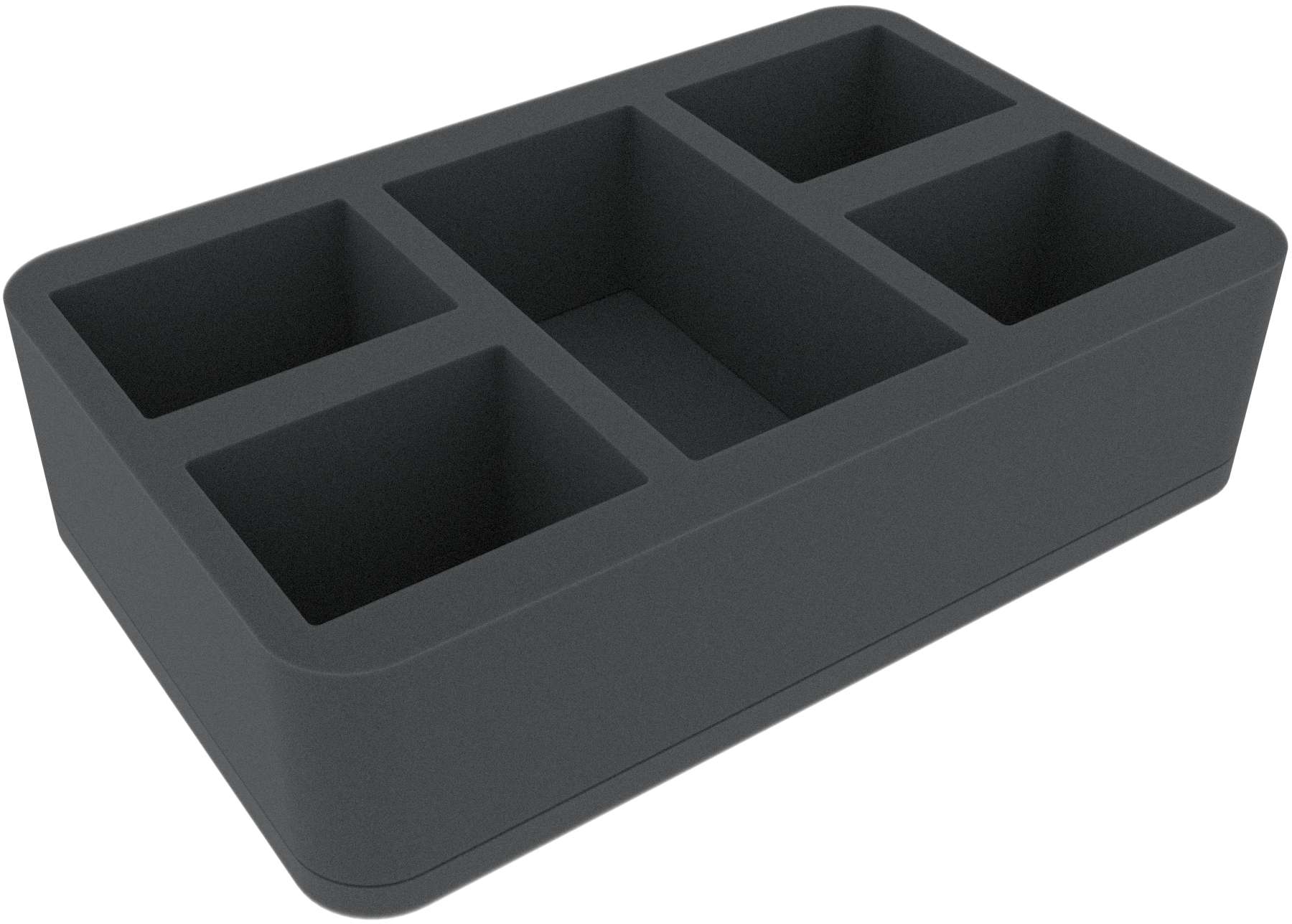 This Half-Size foam tray has 5 compartments of different sizes. It is particularly suitable for the clear storage of game material such as cards, tiles or tokens.