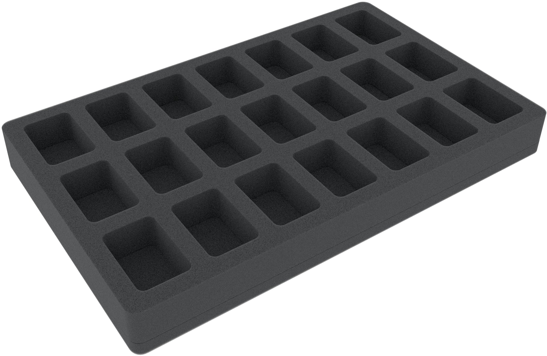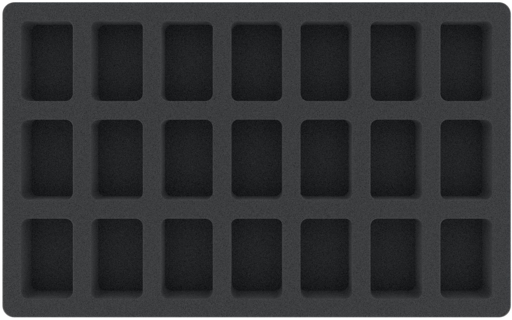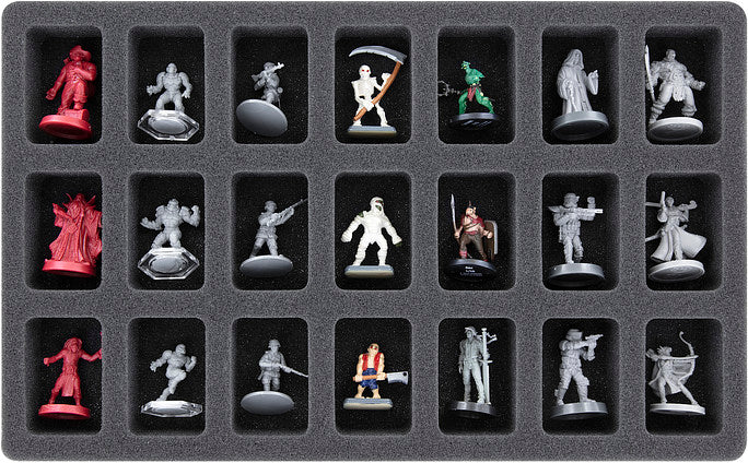 This 35 mm tall foam tray is divided into 21 compartments. It is particularly suitable for the safe storage of tabletop and board game miniatures, as well as other fragile models and small parts.